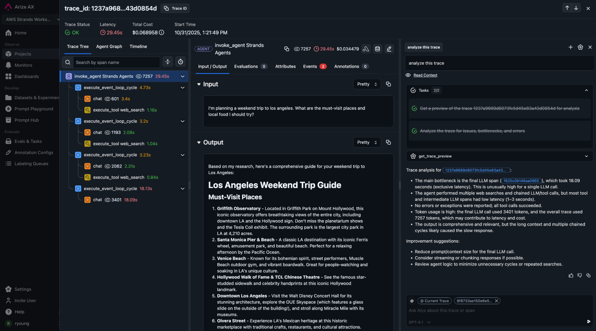 Once deployed, explore traces in Arize. See how the agent reasons through requests. Identify patterns in tool usage. Check cost and latency metrics.