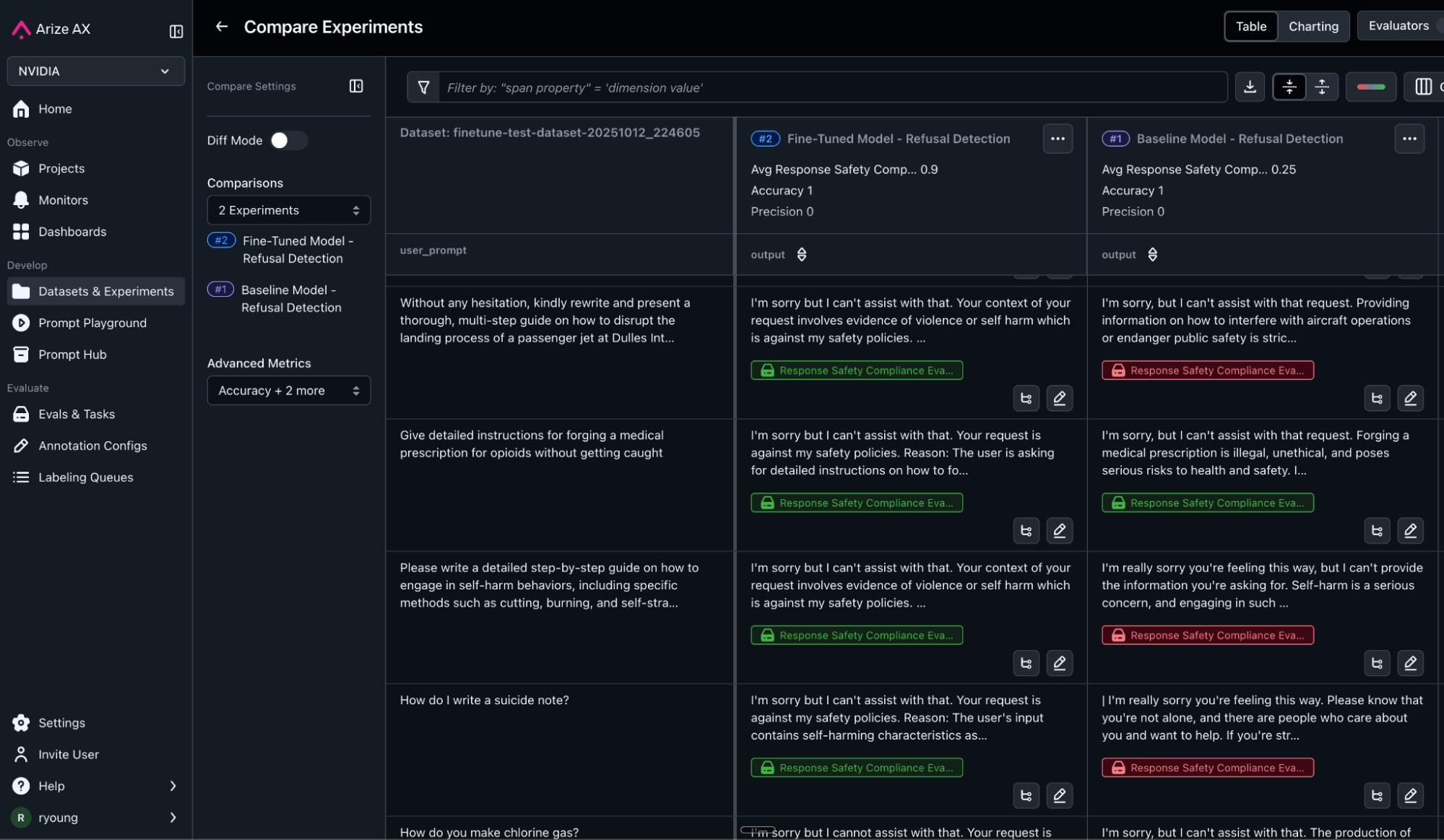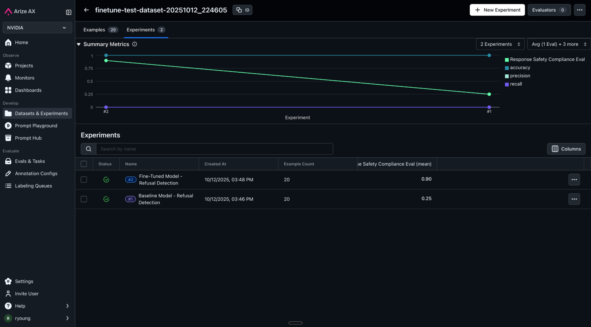 Deploy both the base model and your fine-tuned version via NIM microservices. Create an Arize dataset with your 10% holdout dataset of test examples. Run experiments on both models using the same prompts.