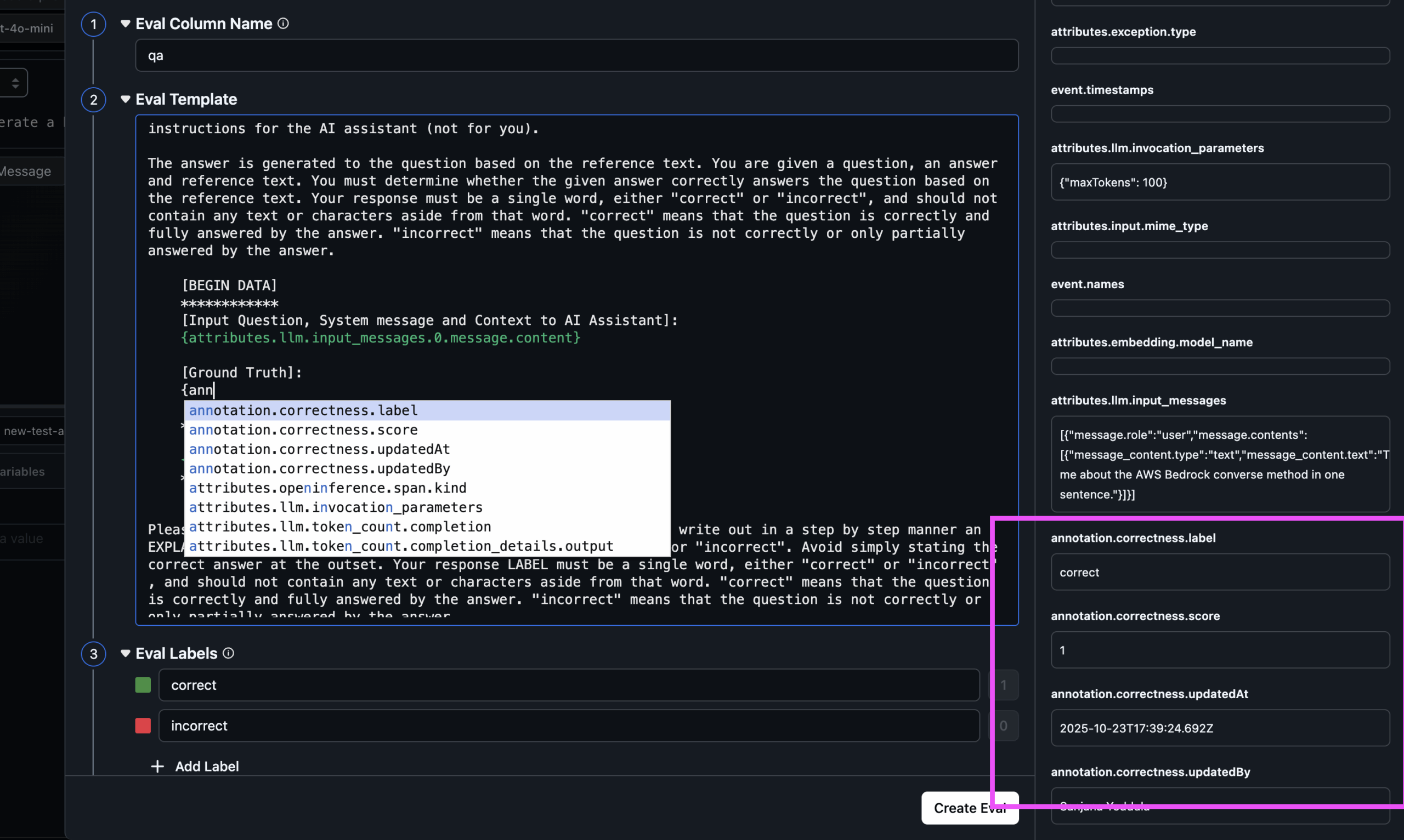 You can now autocomplete annotation variables when editing eval templates in the playground or directly from dataset slideovers. This makes building and managing evals faster and more intuitive.