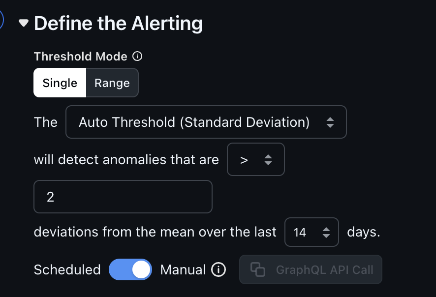 Arize can automatically determine the right threshold for your alerts based on your historical data. This is ideal for most users who want to start monitoring without manually tuning thresholds.