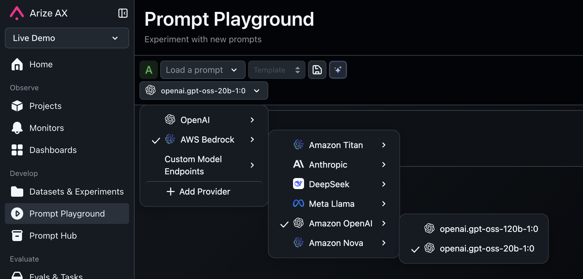 We also added Arize AX support for GPT open-source models available on Bedrock — try them out now in the Prompt Playground!