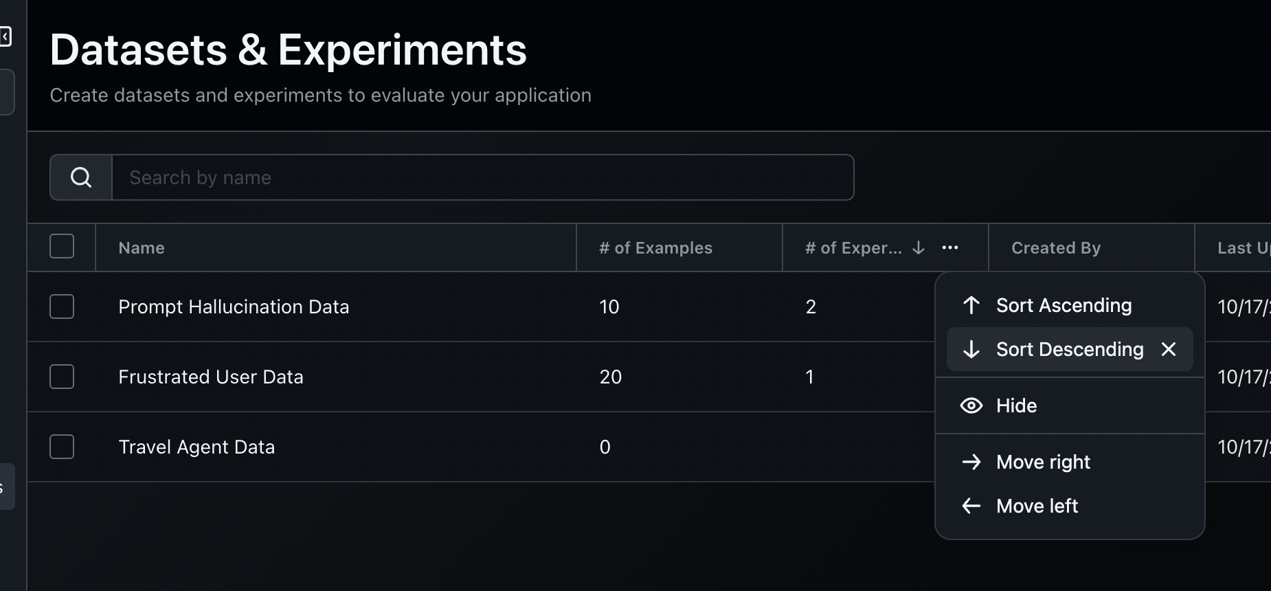 You can now sort your datasets and experiments by name, number of experiments, creation date, and more!