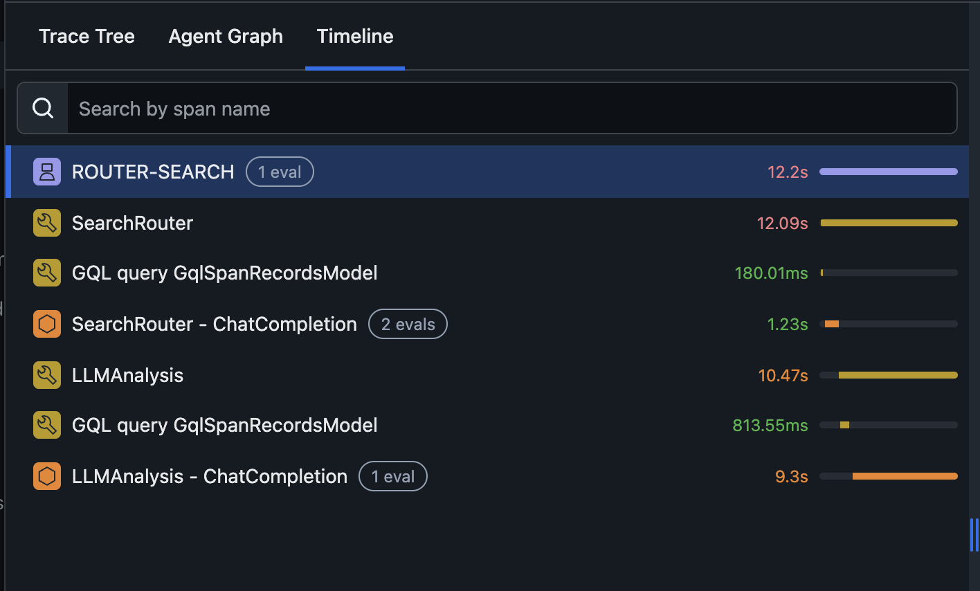 You can now see a timeline view when you click into a trace! The new timeline view is right next to the Trace Tree and Agent Graph tabs, and it shows the execution flow and duration of each span.