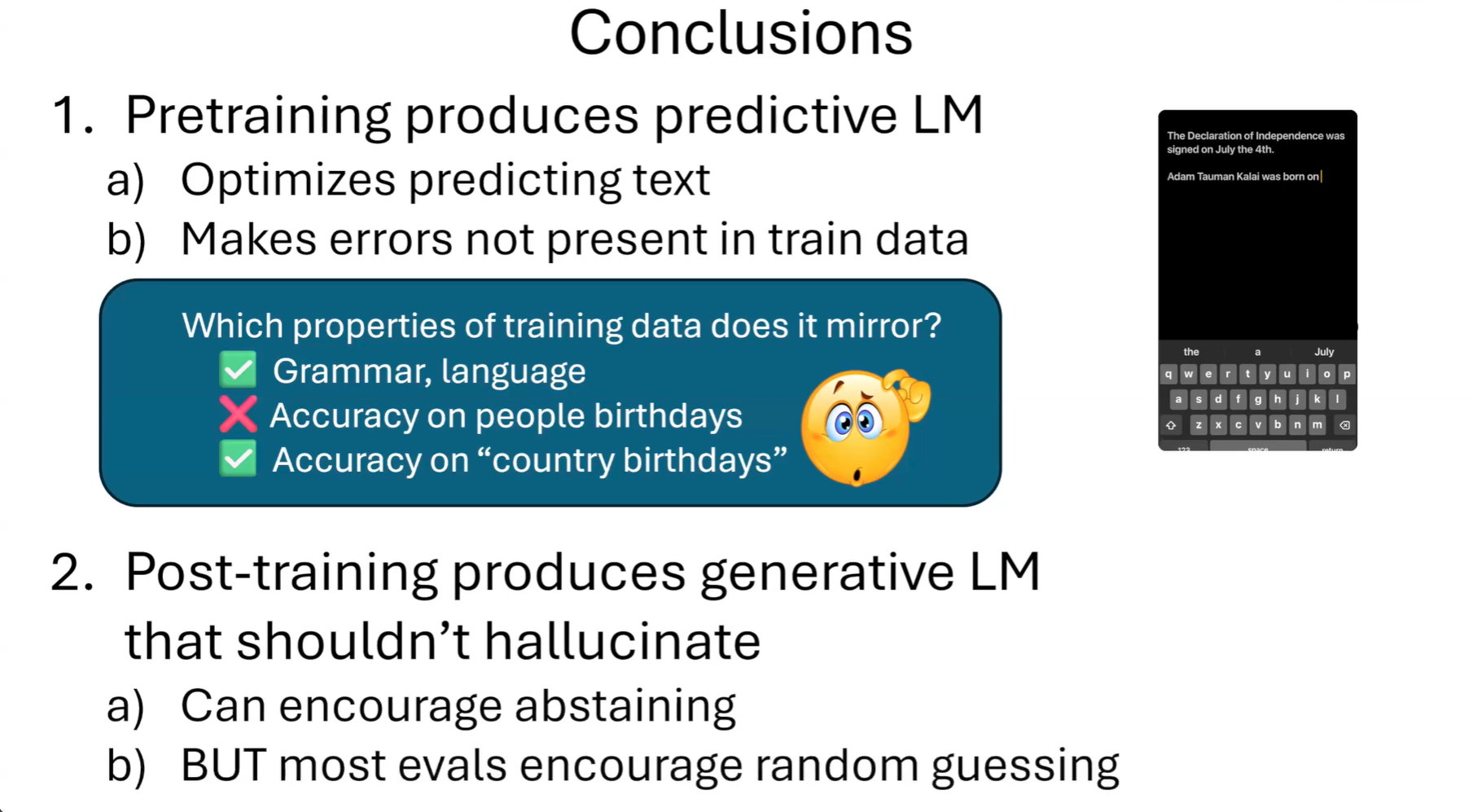“Pre-training produces predictive language models — great at predicting text, even getting things like grammar right. But post-training should produce generative models that don’t hallucinate and know when to abstain.”