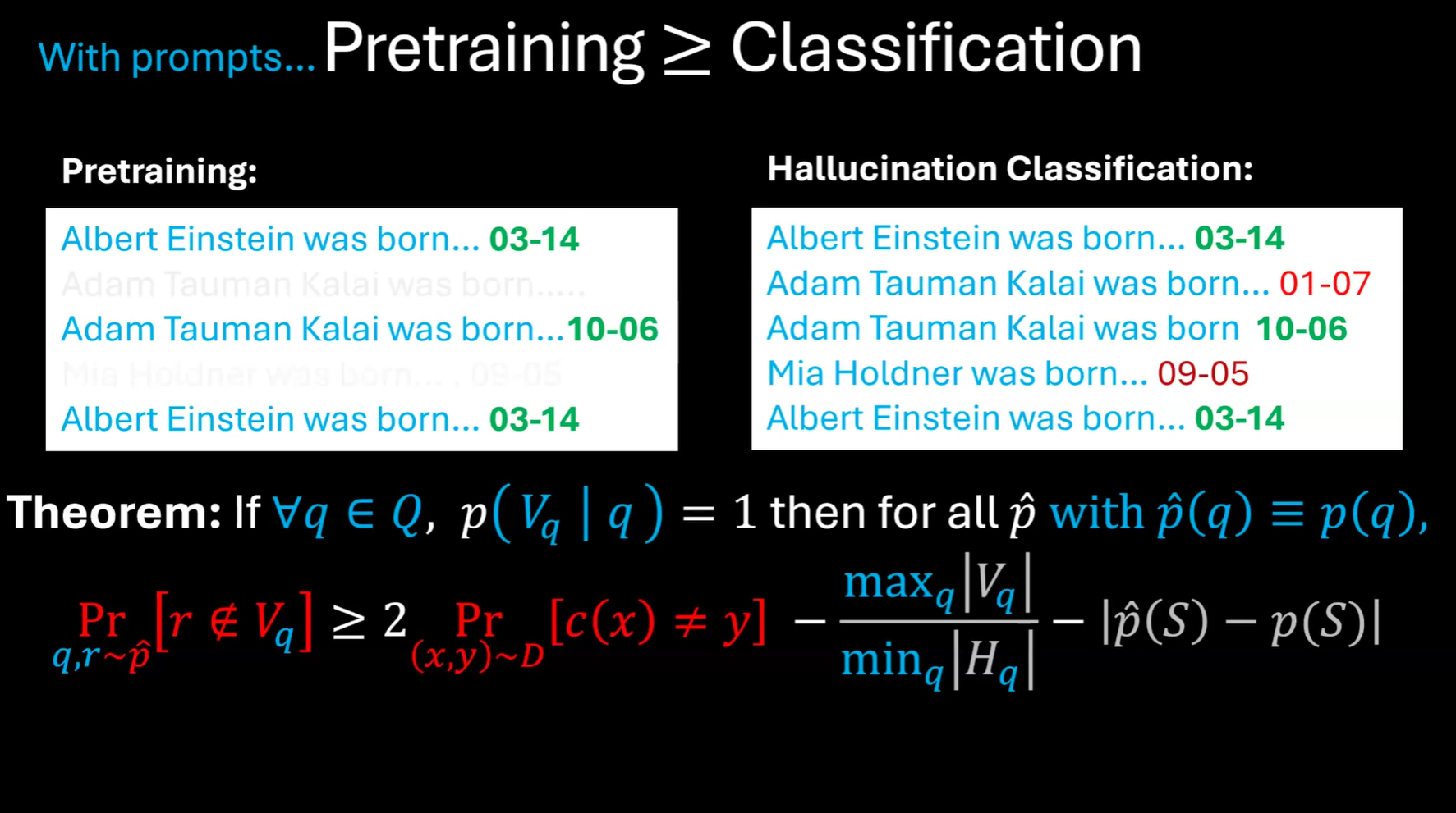 “Our main theorem shows that hallucination rate is at least twice the misclassification rate minus a correction term — meaning, if your classifier can’t tell fact from fiction, your generator will hallucinate.”
