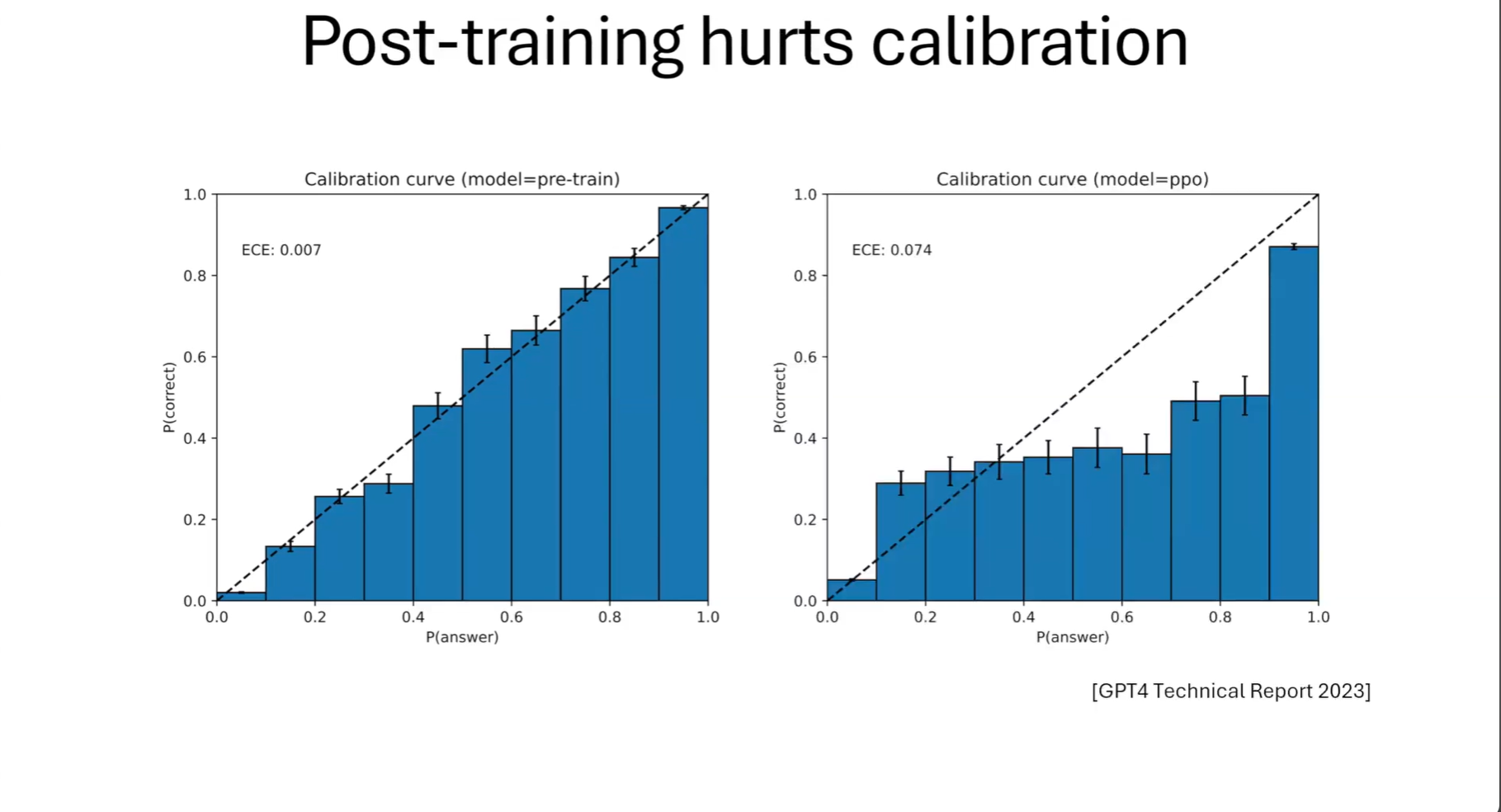 “After pre-training, language models are very well calibrated. But calibration is a weaker goal than accuracy.”