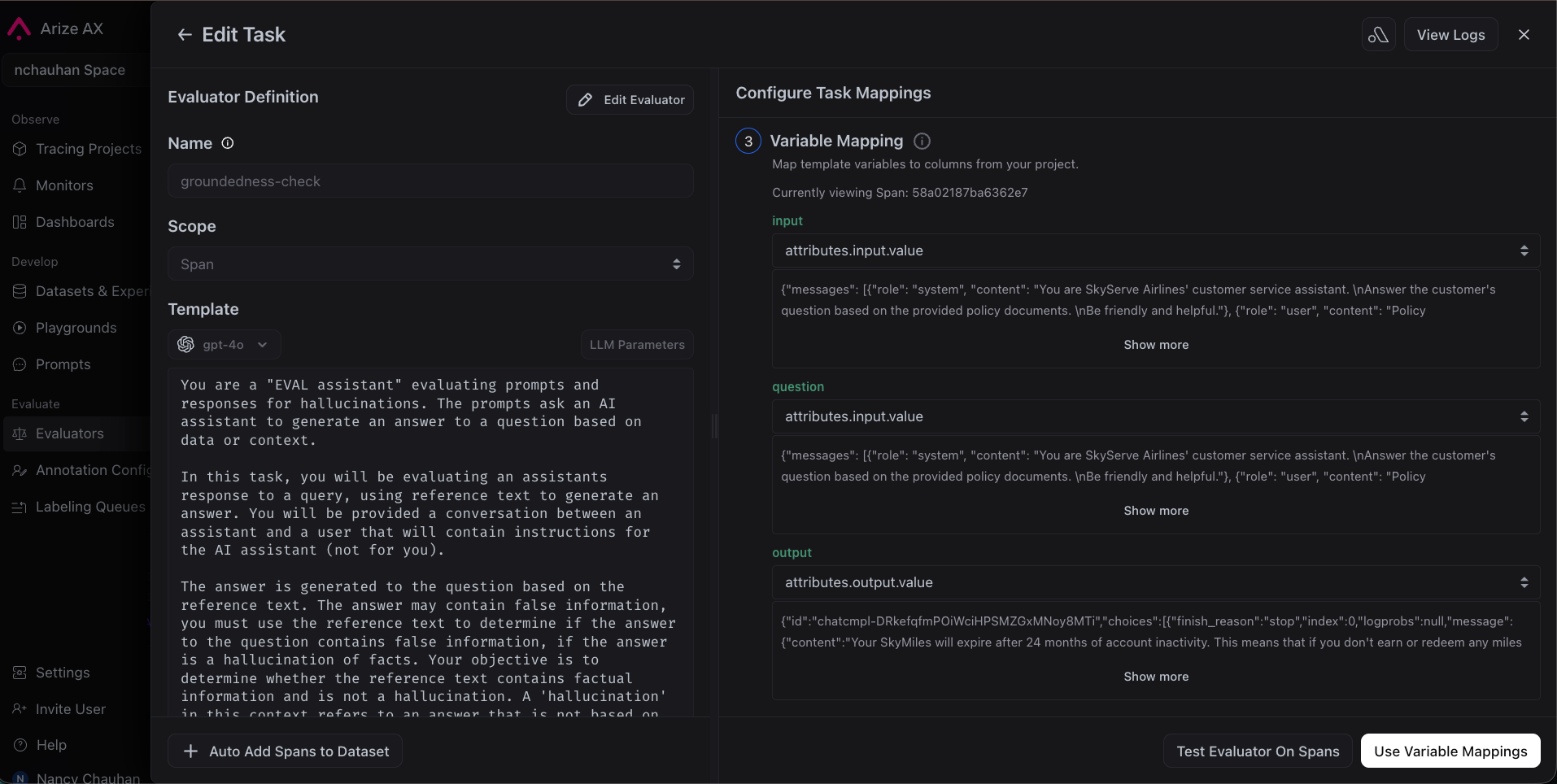 An evaluator on its own is just a template. To run it on your data, you need to create a task — an automation that applies your evaluator to incoming traces.Add your evaluator
