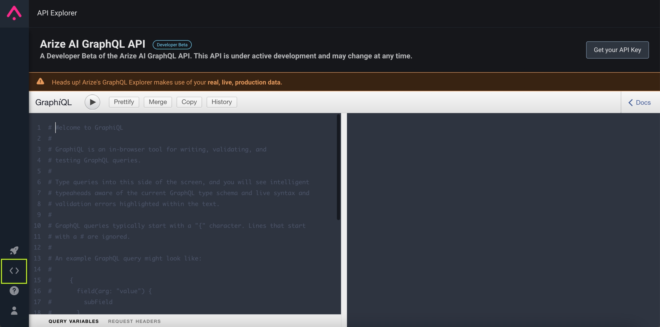 To access the API explorer from any page, enable Developer Access. Navigate to the '<>' button on the bottom left of your screen to easily enter the API explorer.
