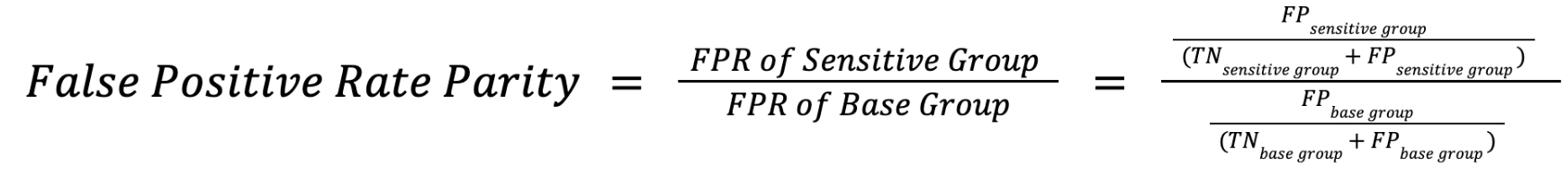 False Positive Rate Parity is a measure of the False Positive Rate (FPR) of a sensitive group as compared to a base group.