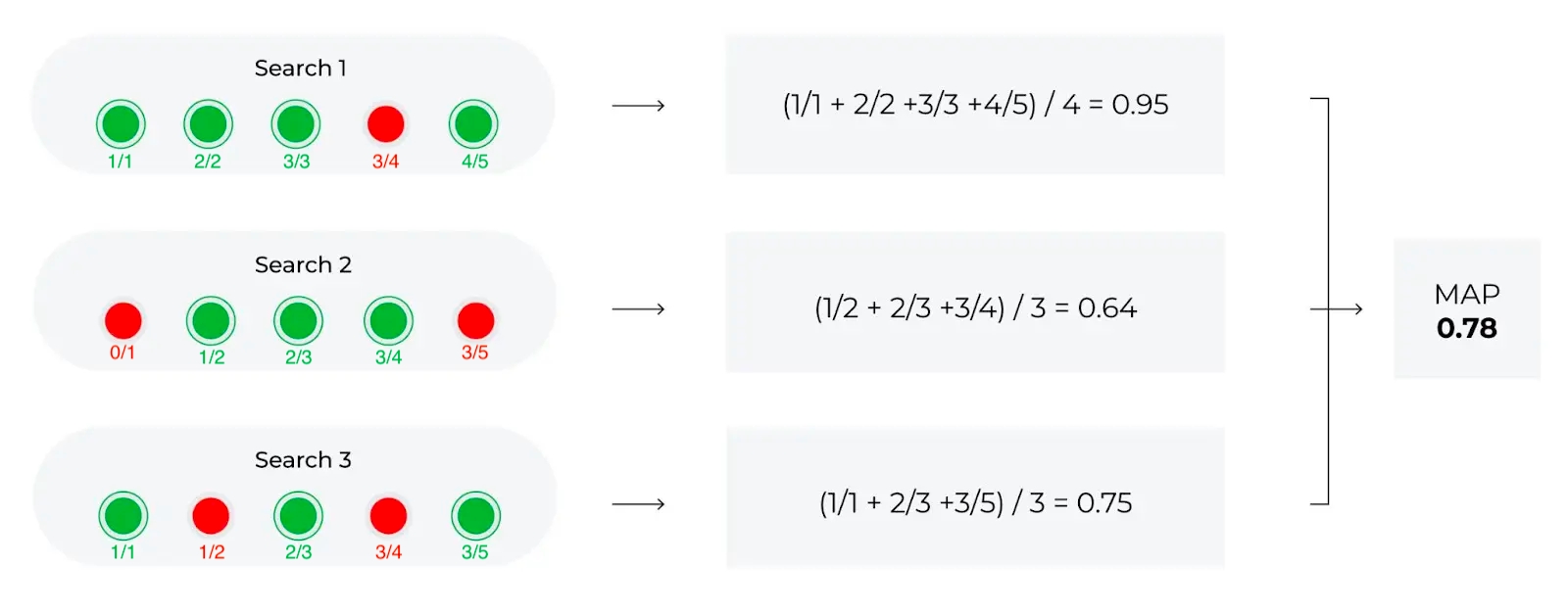 MAP (Mean Average Precision) @K is a metric used to evaluate the performance of a ranking model. MAP weighs errors to account for value differences between the top and bottom of the list but is limited to binary relevancy (relevant/non-relevant) and can not account for order-specific details. The higher the MAP@K score, the better the ranking algorithm or recommendation system performs.