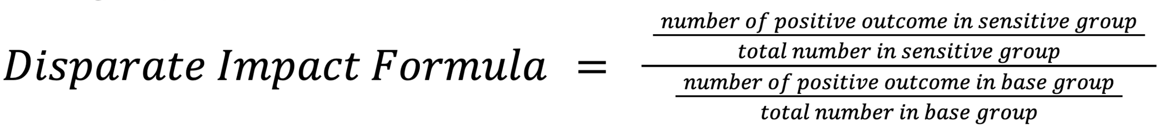 Disparate Impact (also called adverse impact) is a quantitative measure of the adverse treatment of protected classes. The calculation is the proportion of the sensitive group that received the positive outcome divided by the proportion of the base group that received the positive outcome. Disparate impact in United States labor law refers to practices in employment, housing, and other areas that adversely affect one group of people of a protected characteristic more than another, even though rules applied by employers or landlords are formally neutral. Although the protected classes vary by statute, most federal civil rights laws protect based on race, color, religion, national origin, and sex as protected traits, and some laws include disability status and other traits as well. (source: Wikipedia)