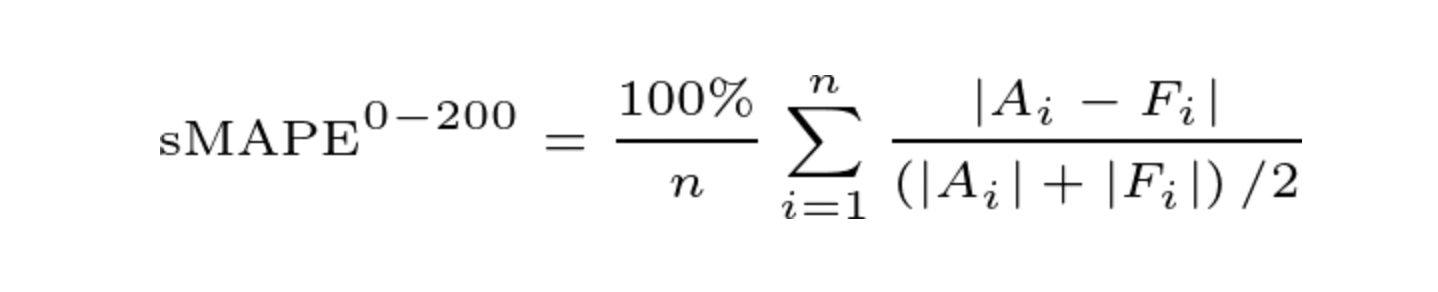 Symmetric Mean Absolute Percentage Error (sMAPE) is an accuracy metric based on percentage. By dividing by both actual and predicted values and normalizing the relative errors, sMAPE overcomes the asymmetric shortcomings found in MAPE. sMAPE ranges with a lower bound of 0% and an upper bound of 200% (in the Arize platform this is reflected from 0—>2), which enables models that have forecasts higher than actuals to attain more accurate negative percentage error approximations.