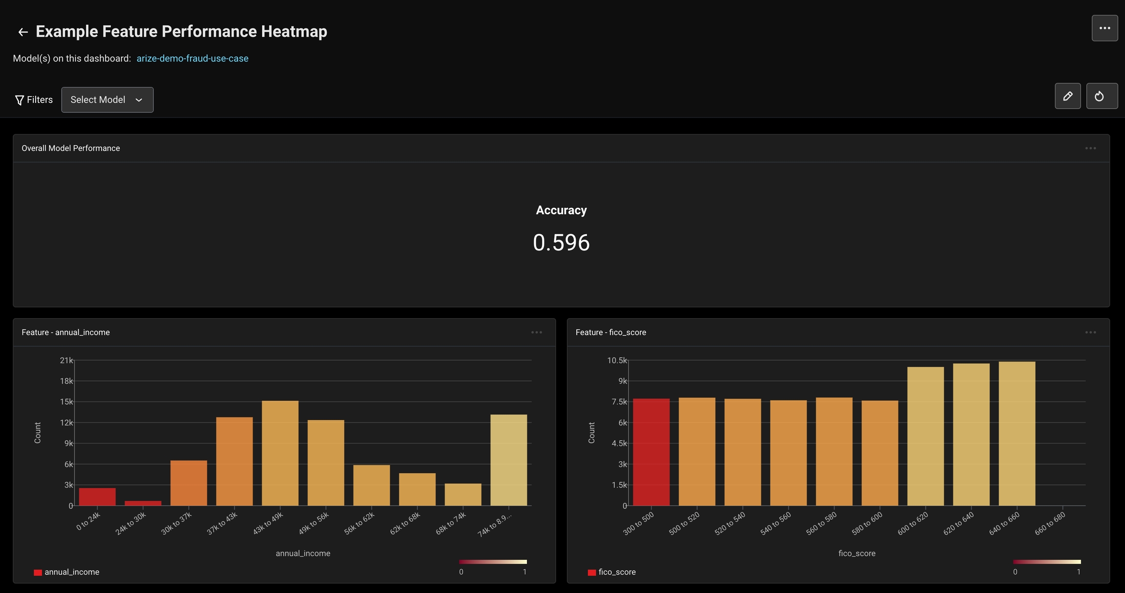 Feature-oriented dashboards help analyze model features, enable quick issue detection, and highlight opportunities for model improvements and retraining.Top Features