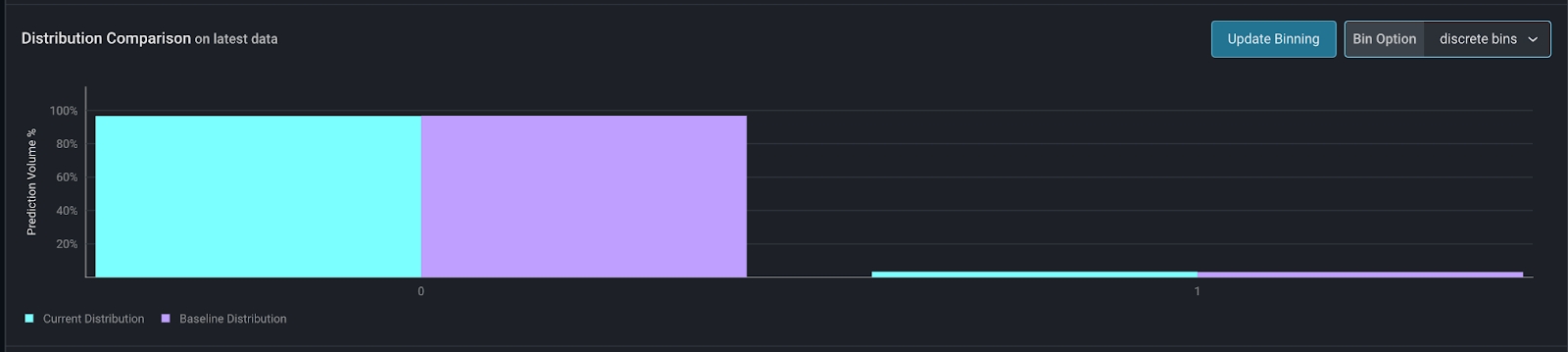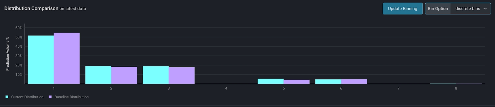 Discrete bins allows users to see each value independently in the distribution chart. Note that for categorical features, this is the only binning option.