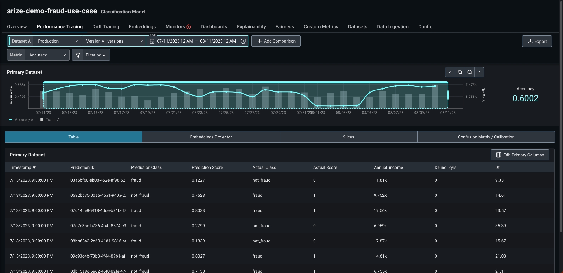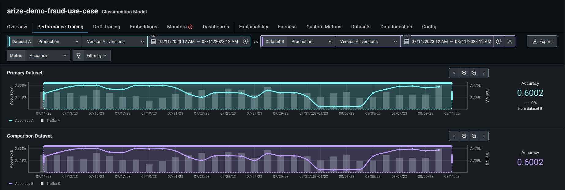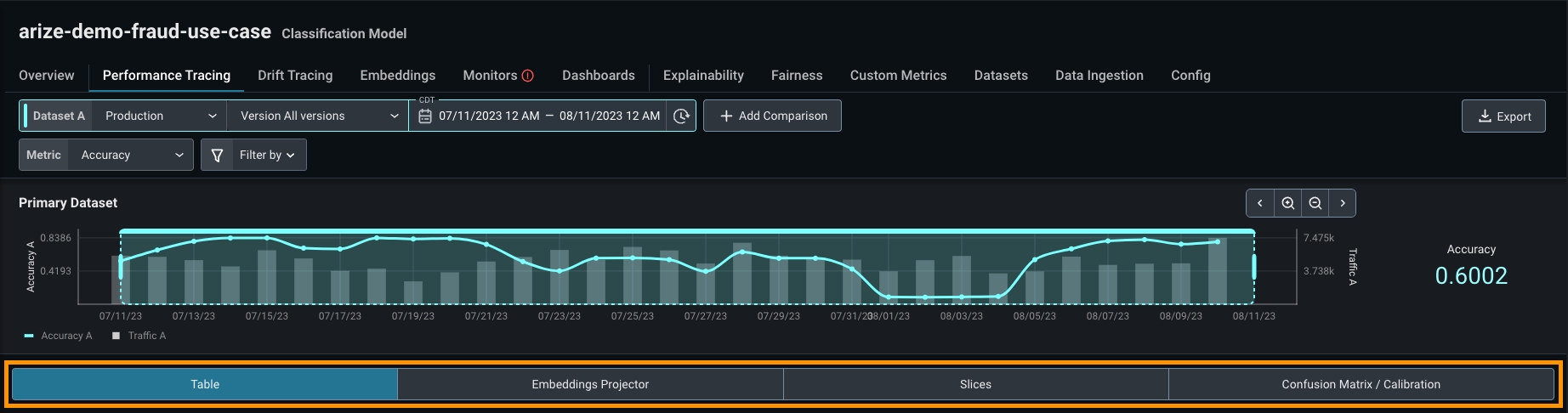 The Performance Tracing tab immediately visualizes your performance metric over time layered on top of your model’s prediction volume. This gives you a broad understanding of your model’s overall performance to identify areas of improvement, compare different datasets, and examine problematic slices. The ‘Performance Over Time’ graph is highly configurable. Use this graph to visualize different dimensions such as:- Environments: pick from production, validation, or training environments