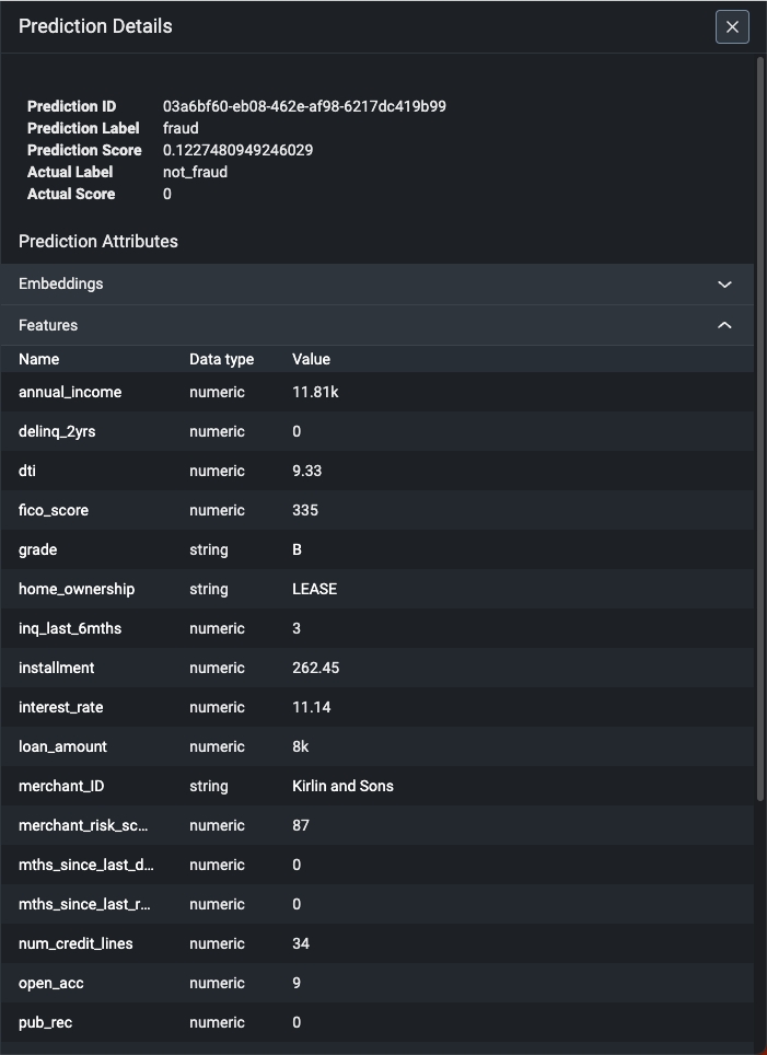 Click on a table row to get a comprehensive view at the prediction level of all of the columns of your data for deeper analysis.