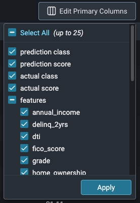 Explore any column in your data, including features and tags, using the column selector. Customize your table view by adding/removing columns, and re-ordering columns.