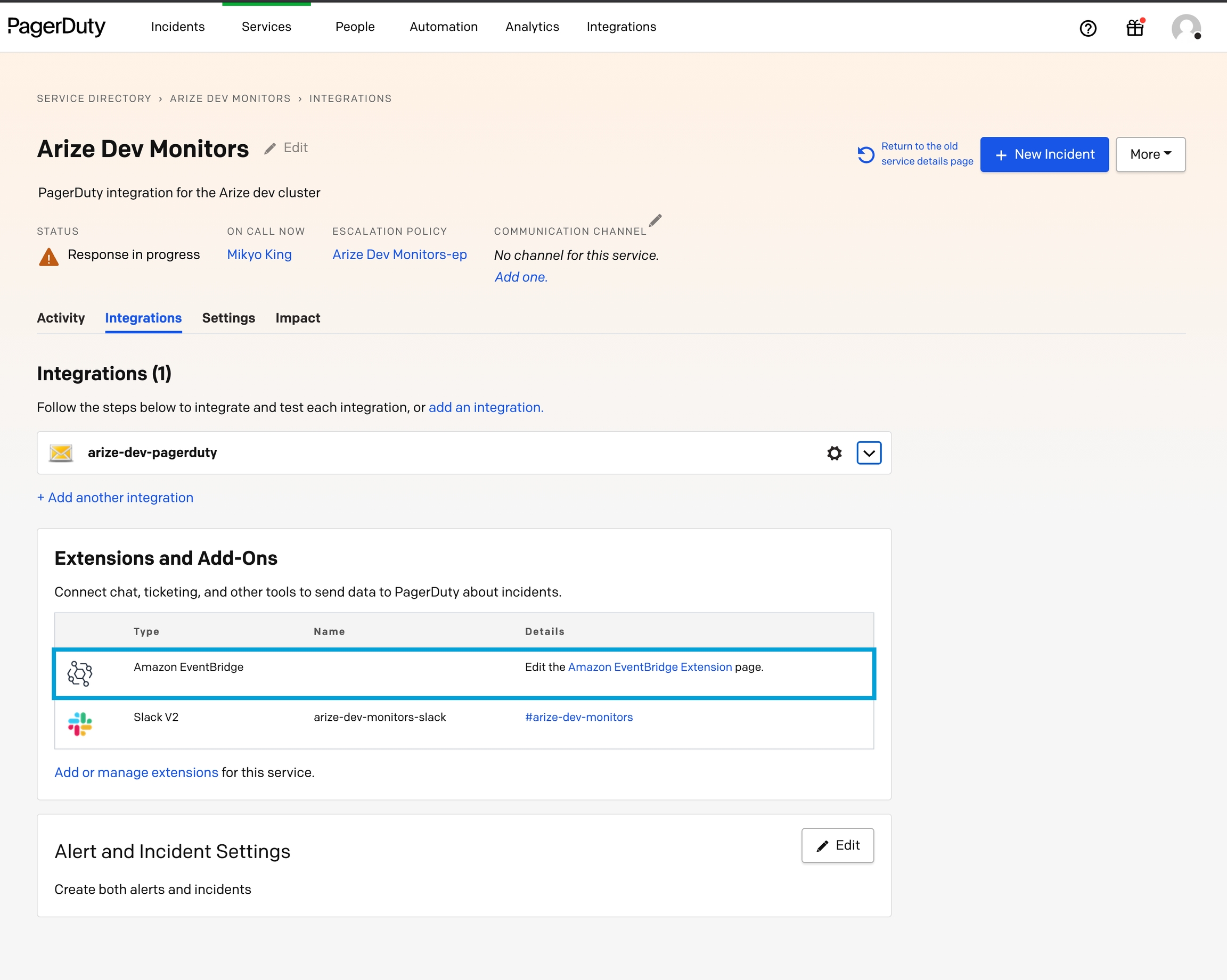 Once you have Arize monitors integrated into your incident management platform, you’ll have to configure the incident management platform to publish events to EventBridge. In this example, we use PagerDuty as our incident management platform and integrate with EventBridge by following the steps outlined in their integration guide.