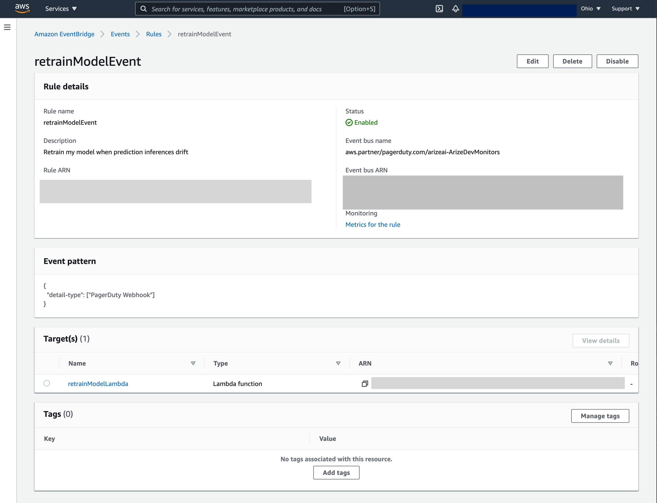 In order to react to Arize’s monitoring events, we need to configure a Lambda function that will parse the incident details and trigger a custom workflow. Below is an example Lambda that can be used as a template when integrating with PagerDuty’s incident event payload:Step 3: Connect EventBridge with your lambda handler