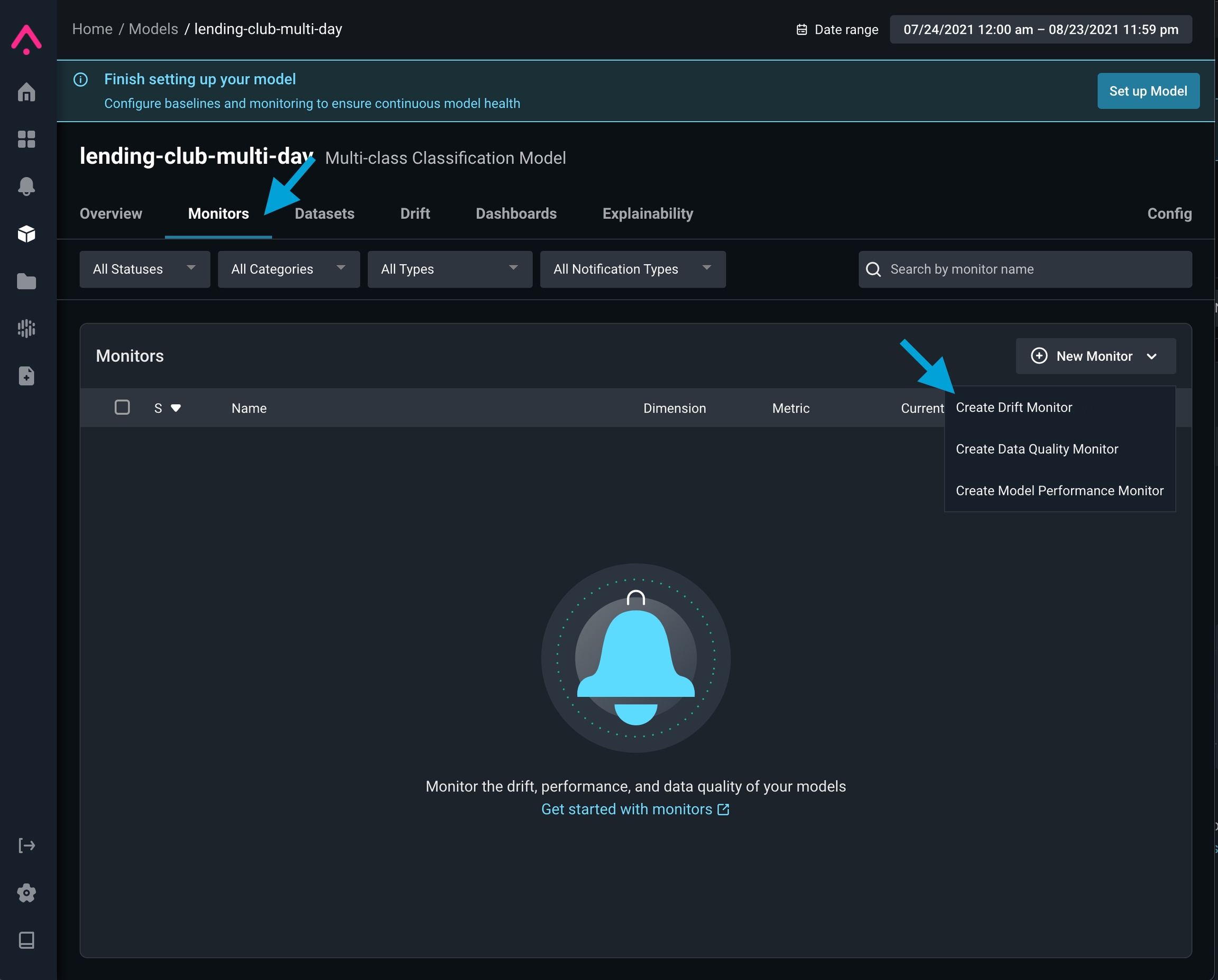 Navigate to your model’s monitor tab, click onnew monitor and select drift monitor