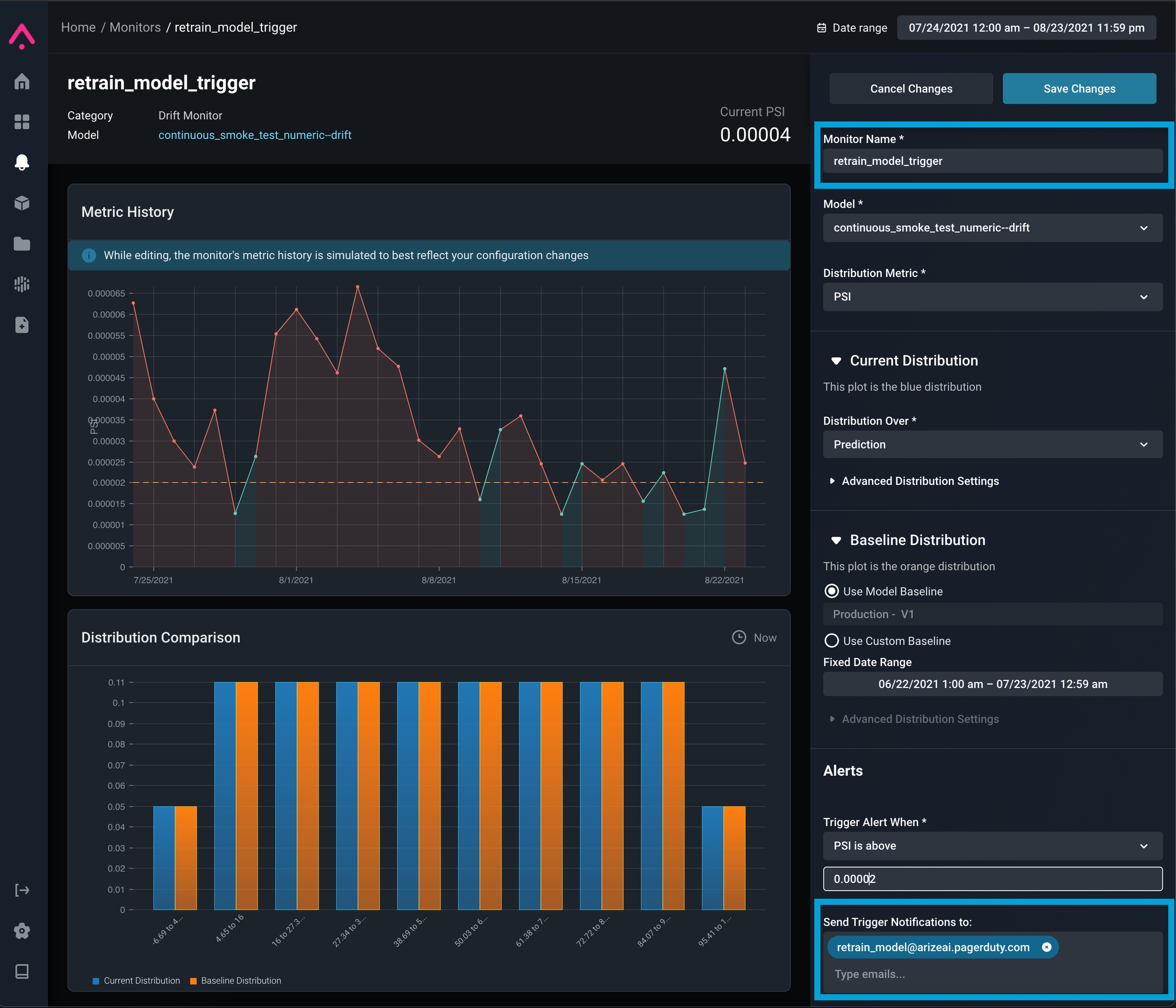 retrain_model ) and to use your Integration Email Address (ex. arize-model-integration@<company>.pagerduty.com - see the PagerDuty guide for details)