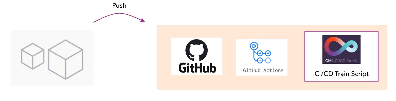 The CI/CD workflow for models with CML involves a training script and a linkage to Github actions.