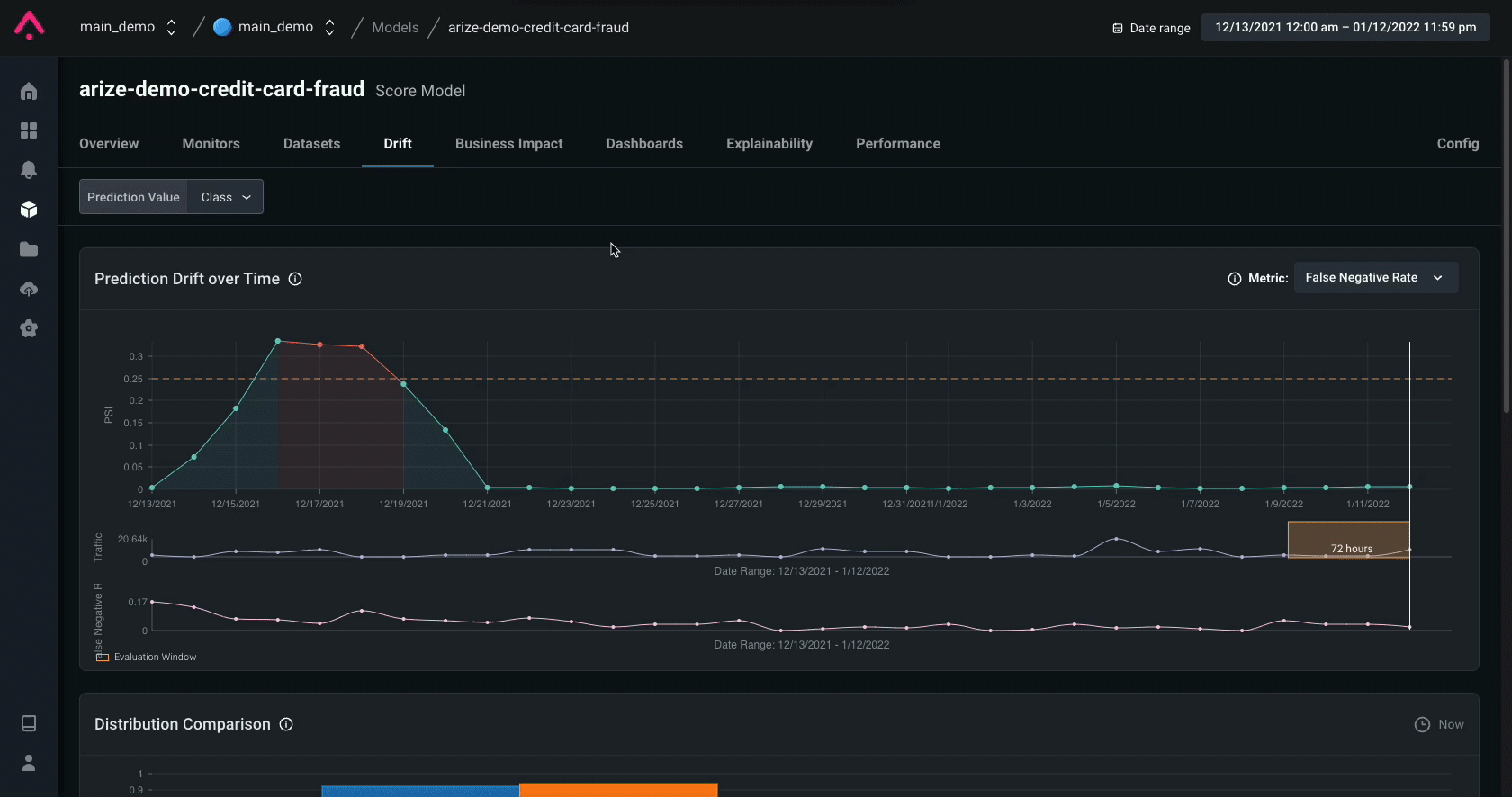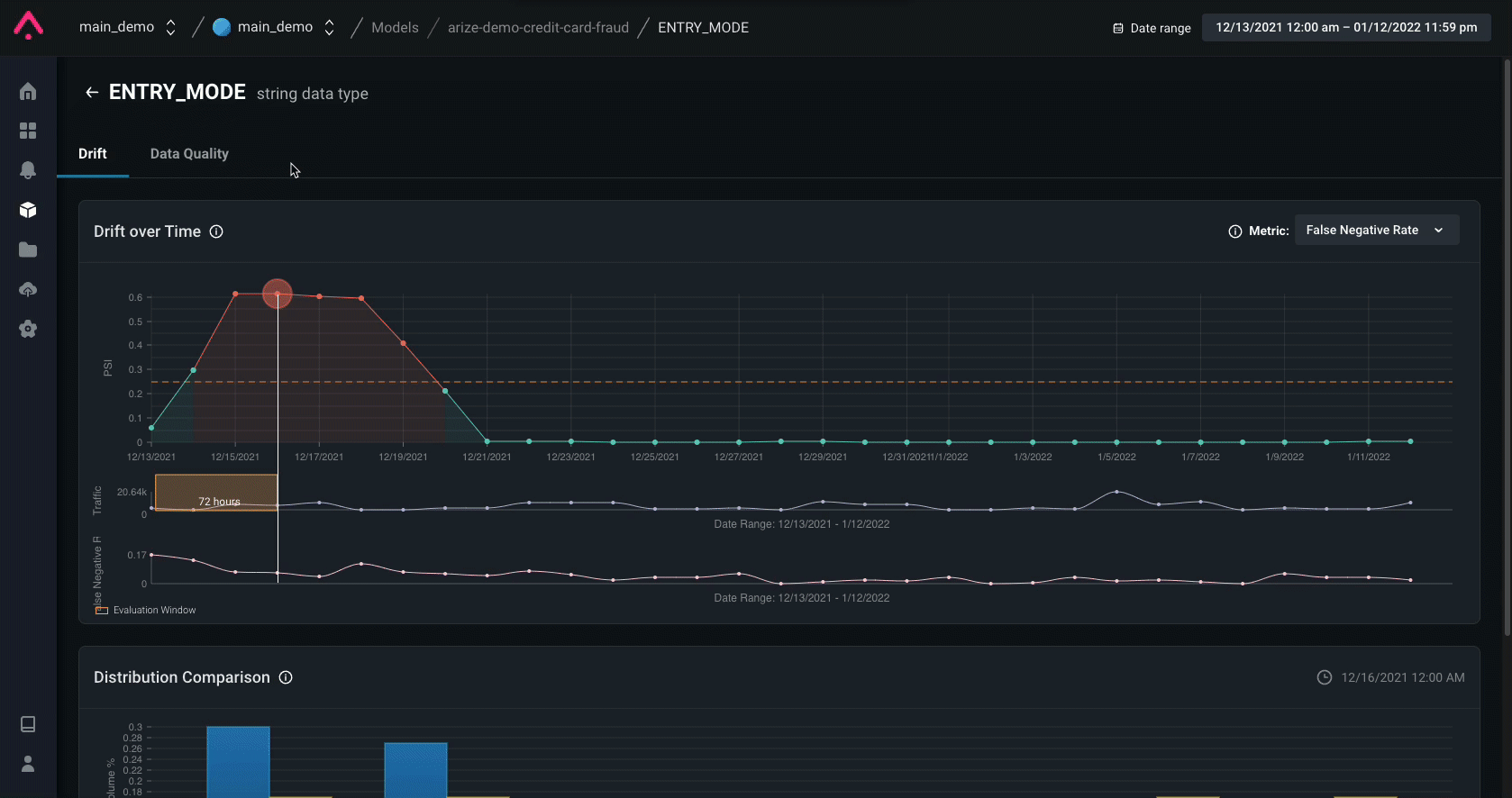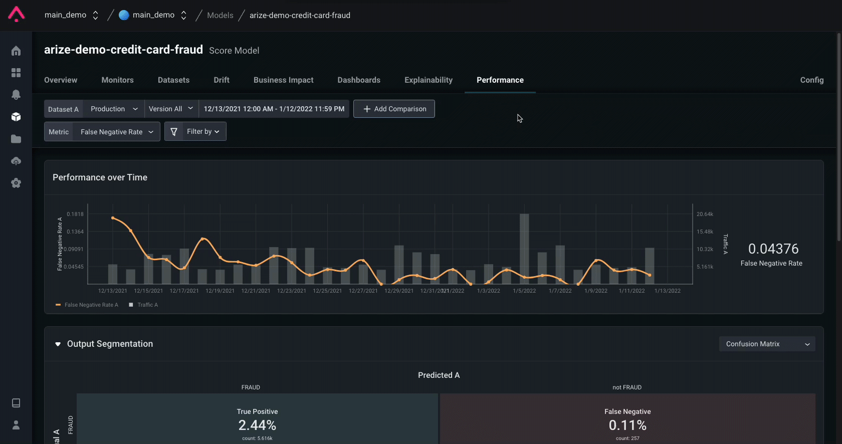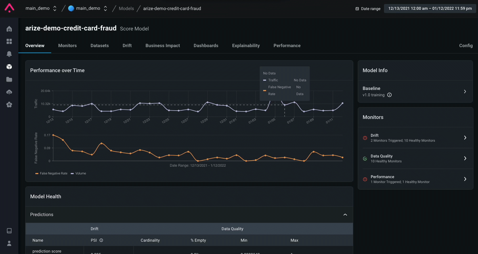 In this walkthrough, we will use the Arize platform to monitor a Fraud Detection model’s performance. This use case will walk you through how to manage your model’s performance for your fraud detection models. While you may have found optimal model performance in the training environment after spending a great deal of time collecting data and training your model, it’s common that your model will perform worse in the production environment. With a limited availability of tools to monitor your model performance, identify root cause issues, or gain insights into how to actively improve your model, troubleshooting your model performance issues can prove to be troubling. In this walkthrough, we will look at a few scenarios common to a fraud model when monitoring for performance. You will learn to:- Get training, validation, and production data into the Arize platform
