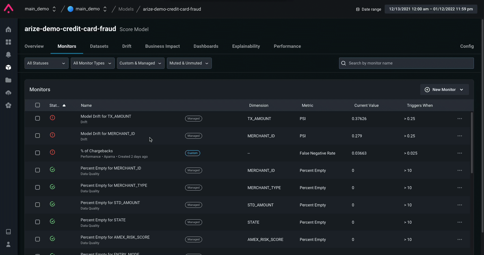 Arize sets up monitors across all features, predictions, and actual values. In fraud detection it’s important to monitor your model’s:-
