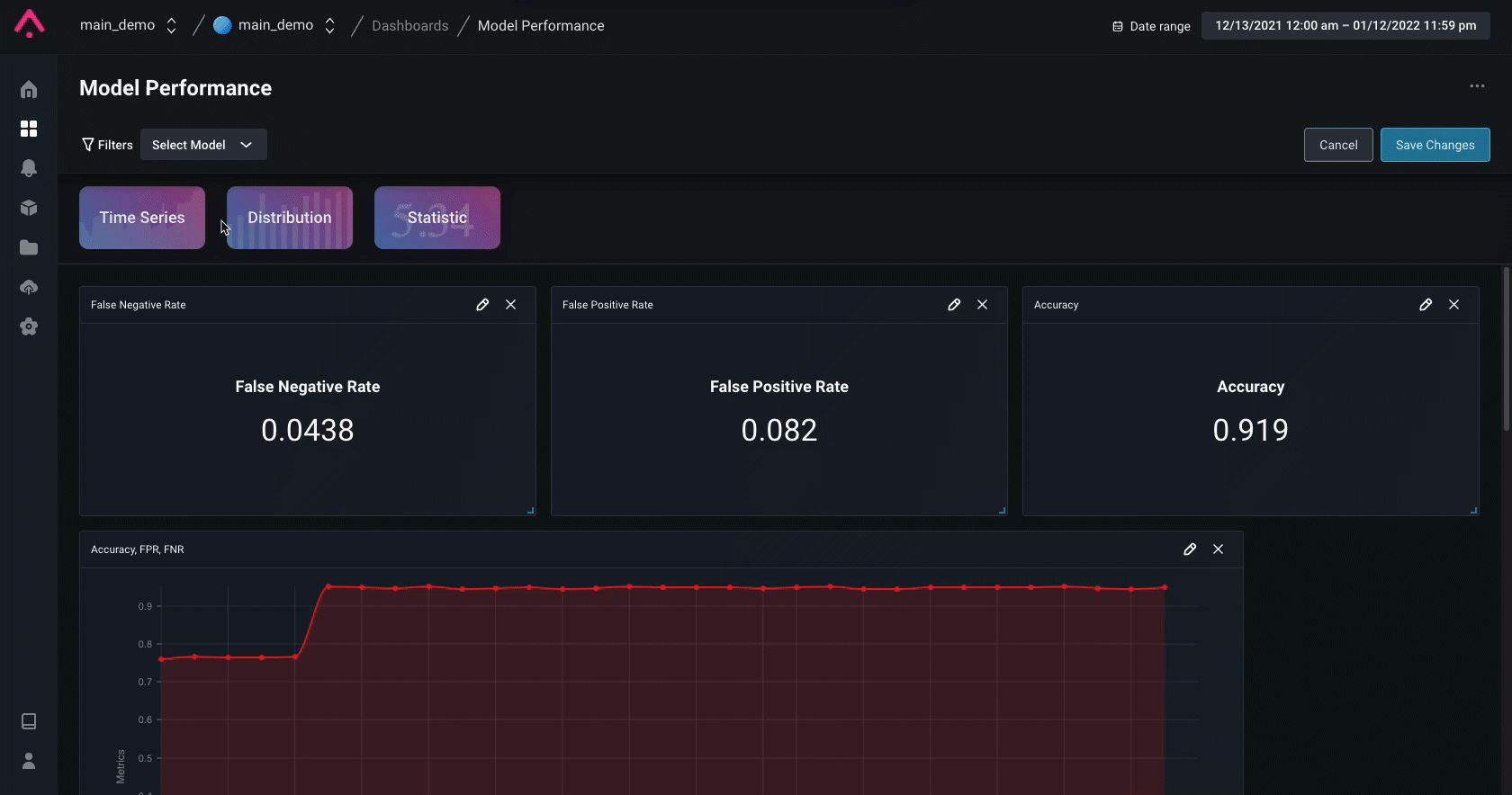 In the case of credit card fraud, the most important metrics to worry about are your False Positive, False Negative, and overall Accuracy rates. Note, Recall is the inverse of False Negative Rate if your positive class is Fraud. In only a few clicks you can add widgets to provide a single glance view of your model’s Accuracy, False Positive Rate, and False Negative Rate. To visualize these metrics over time you can also create a custom timeseries widget which overlays three plots to showcase the fluctuation of these metrics over time.