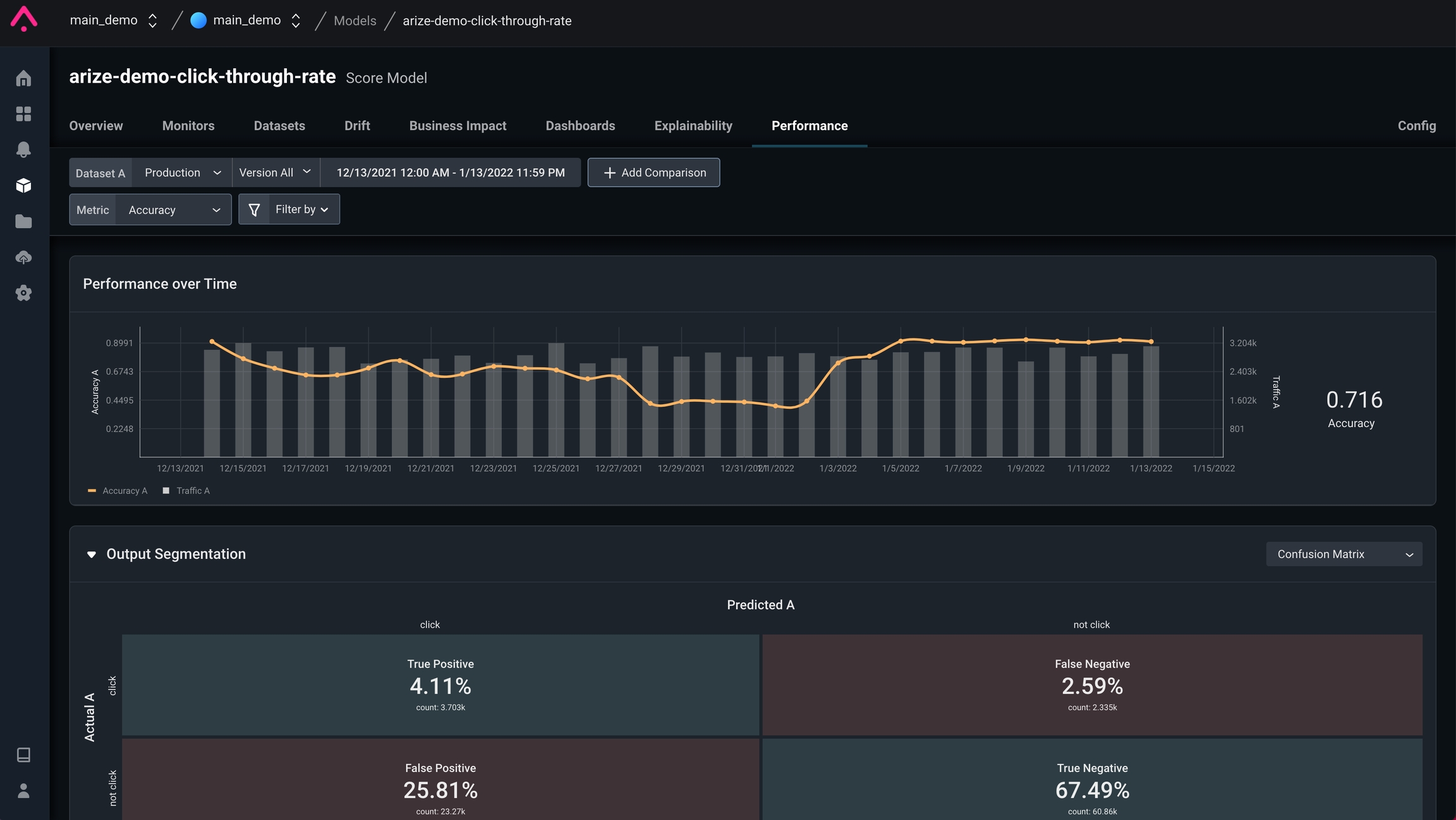 Arize sets up monitors across all features, predictions, and actual values. For click-through rate, it’s important to monitor the model’s Accuracy.