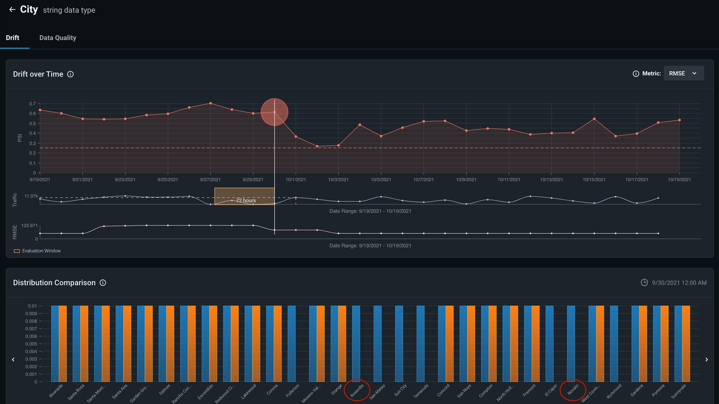 Visualize feature and model drift between various model environments and versions to identify LTV patterns and anomalous distribution behavior. Arize provides drift over time widgets overlaid with your metric of choice (in our case, RMSE) to clearly determine if drift is contributing to our performance degradation.