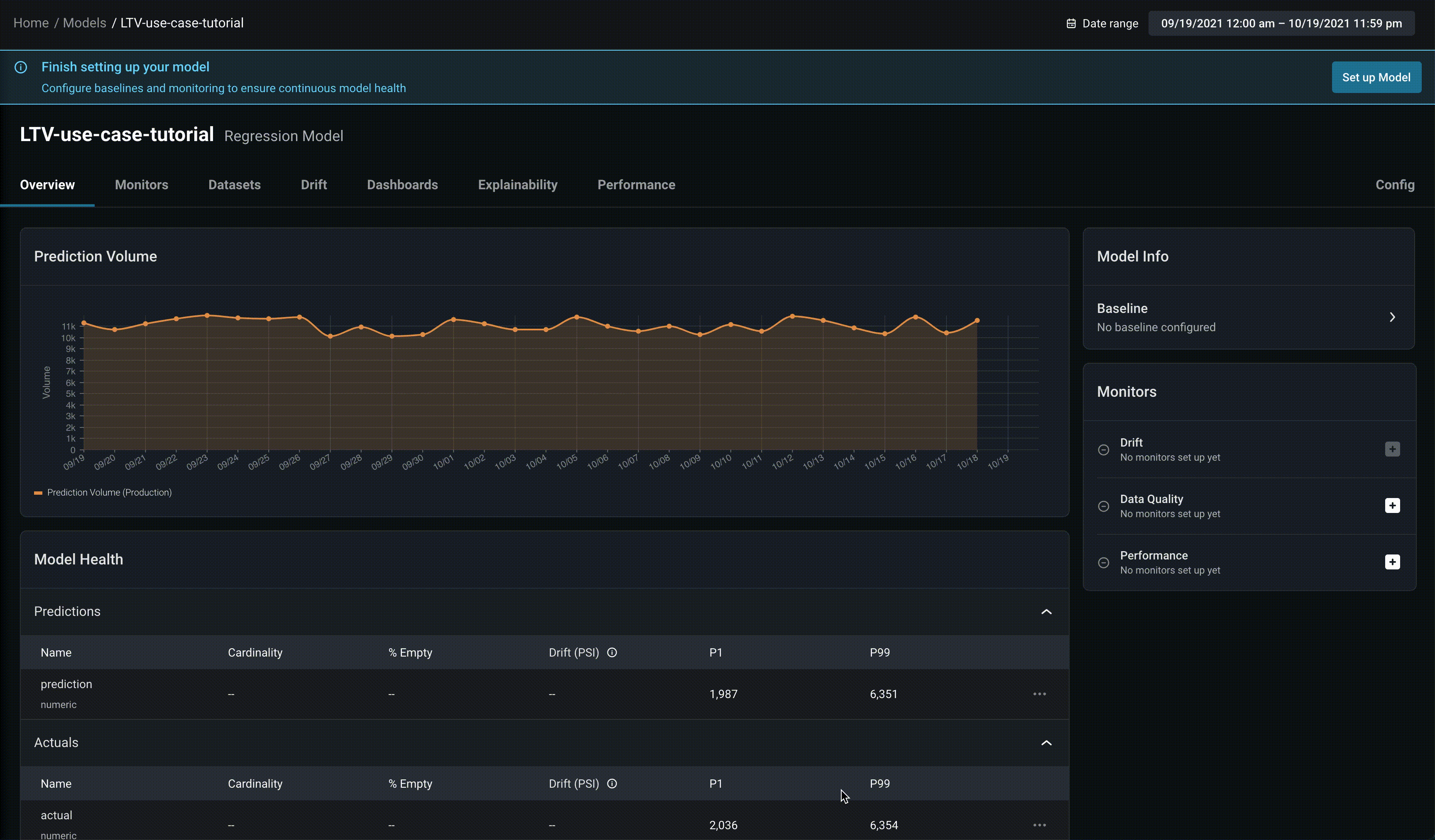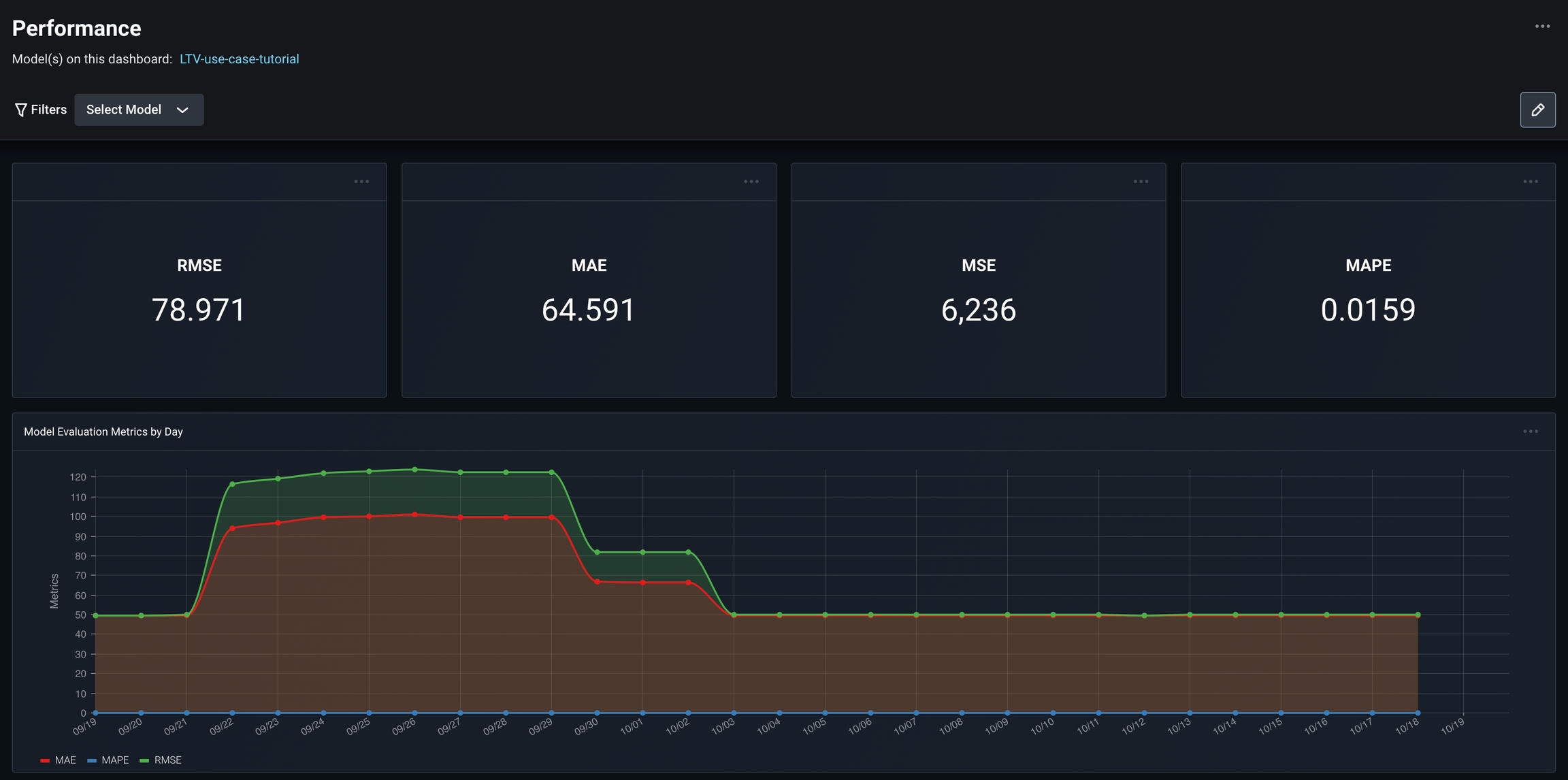 As we continue to check in and improve our model’s performance, we want to be able to quickly and efficiently view all our important model metrics in a single pane. Use our Regression Model Performance Dashboard to set up a customizable dashboard for a single glance view of your model’s important metrics.In the case of LTV, we look at the model’s RMSE, MAPE, and MAE values.