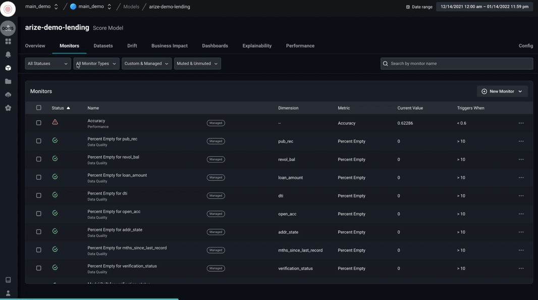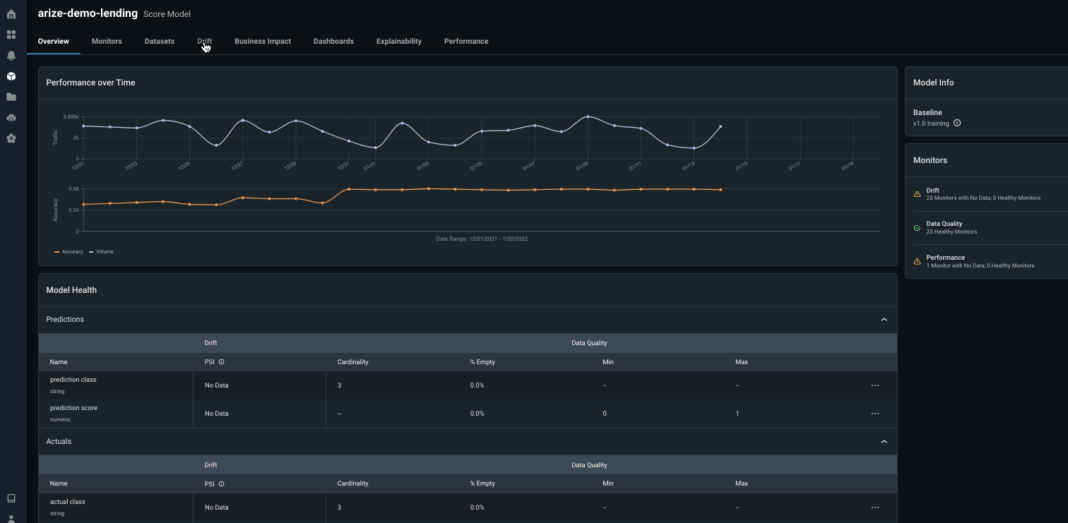In this walkthrough, we will use the Arize platform to monitor a Lending Prediction model’s performance. This use case will walk you through how to manage your model’s performance for your lending models. While you have spent a great deal of your time collecting online data and training models for it’s best performance in the training environment, it’s common that your models in production have a limited number of tools available to monitor your model performance, identify root cause issues, or gain insights into how to actively improve your model. In this walkthrough, we will look at a few scenarios common to lending models when monitoring for performance. You will learn to:- Get training, validation, and production data into the Arize platform