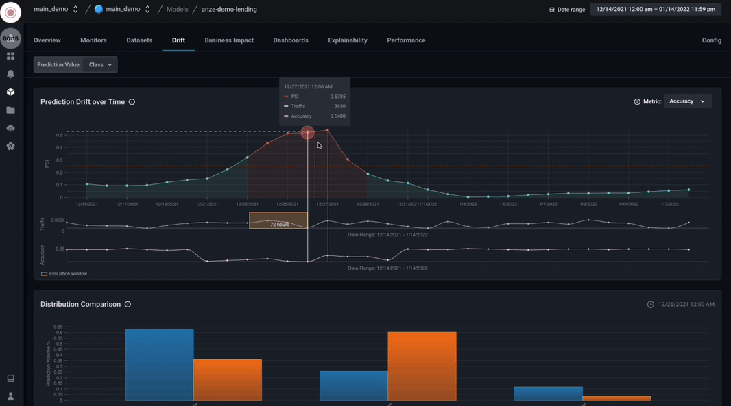 Drift is a change in distribution over time, measured for model inputs, outputs, and actuals of a model. Measure drift to identify if your models have grown stale, you have data quality issues, or if there are adversarial inputs in your model. Detecting drift in your models will help protect your models from performance degradation and allow you to better understand how to begin resolution.Prediction Drift Impact can surface when drift has impacted your model. Drift (PSI) is a measurement of how much your distribution has drifted. Lastly, Feature Importance helps your explain why even small Drift (PSI) can have significant Drift Impact.