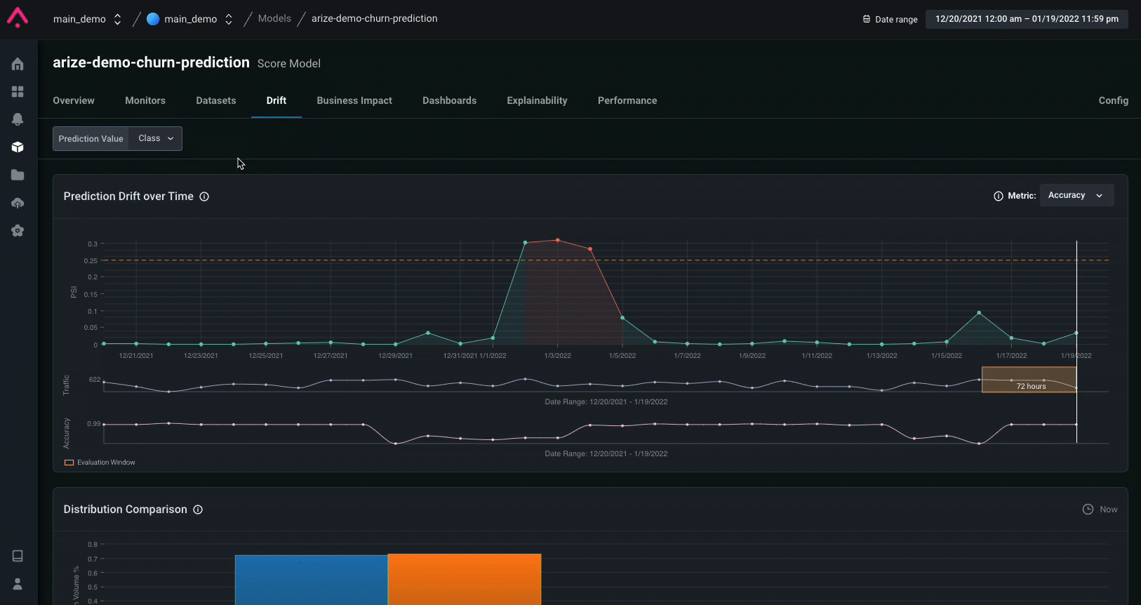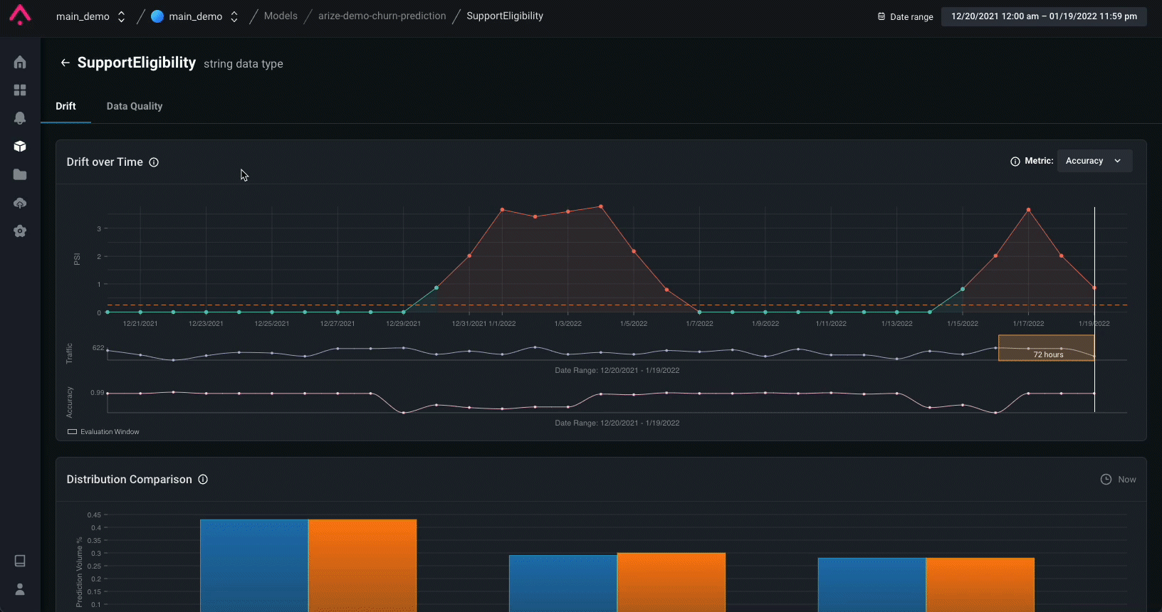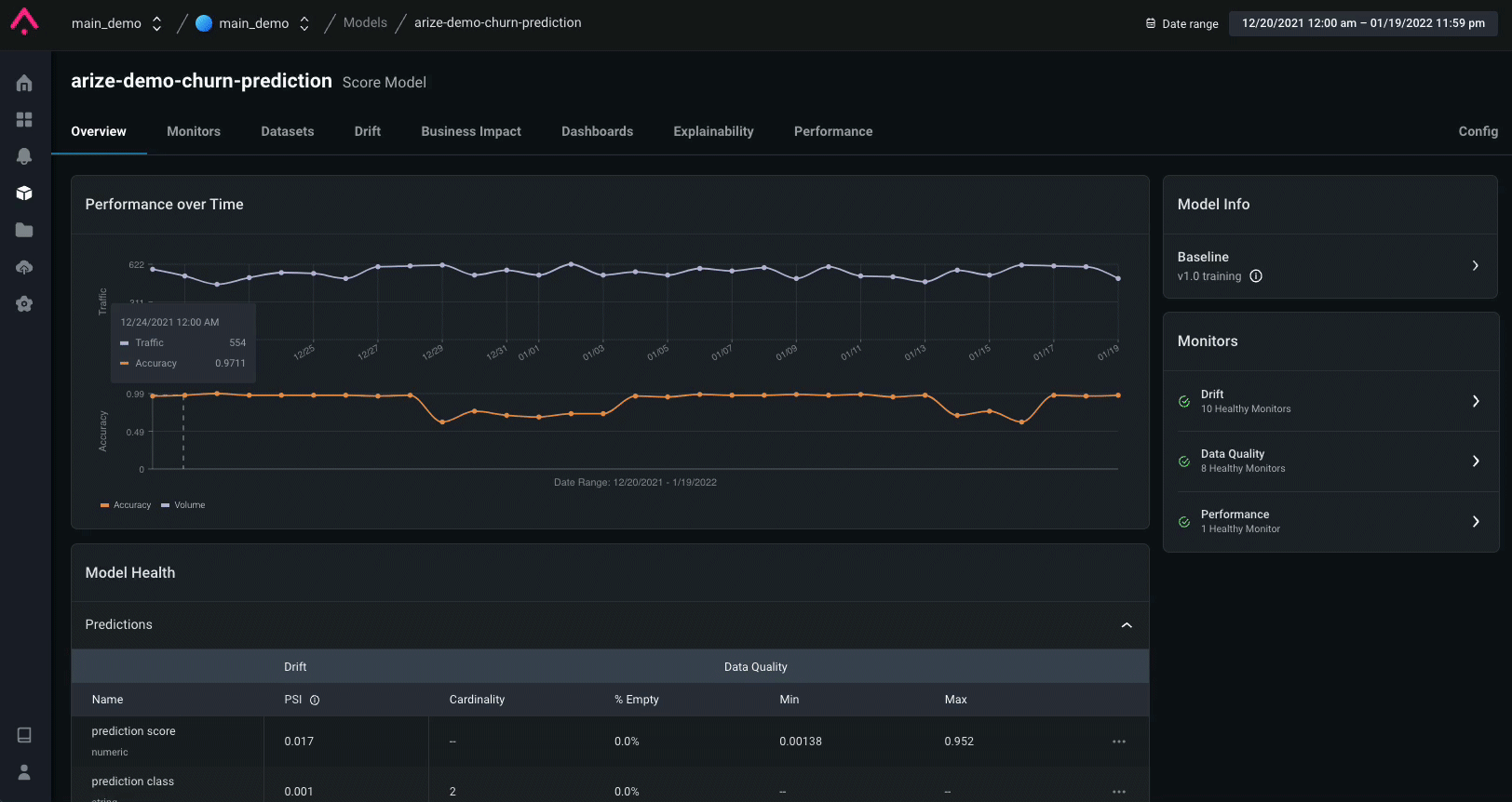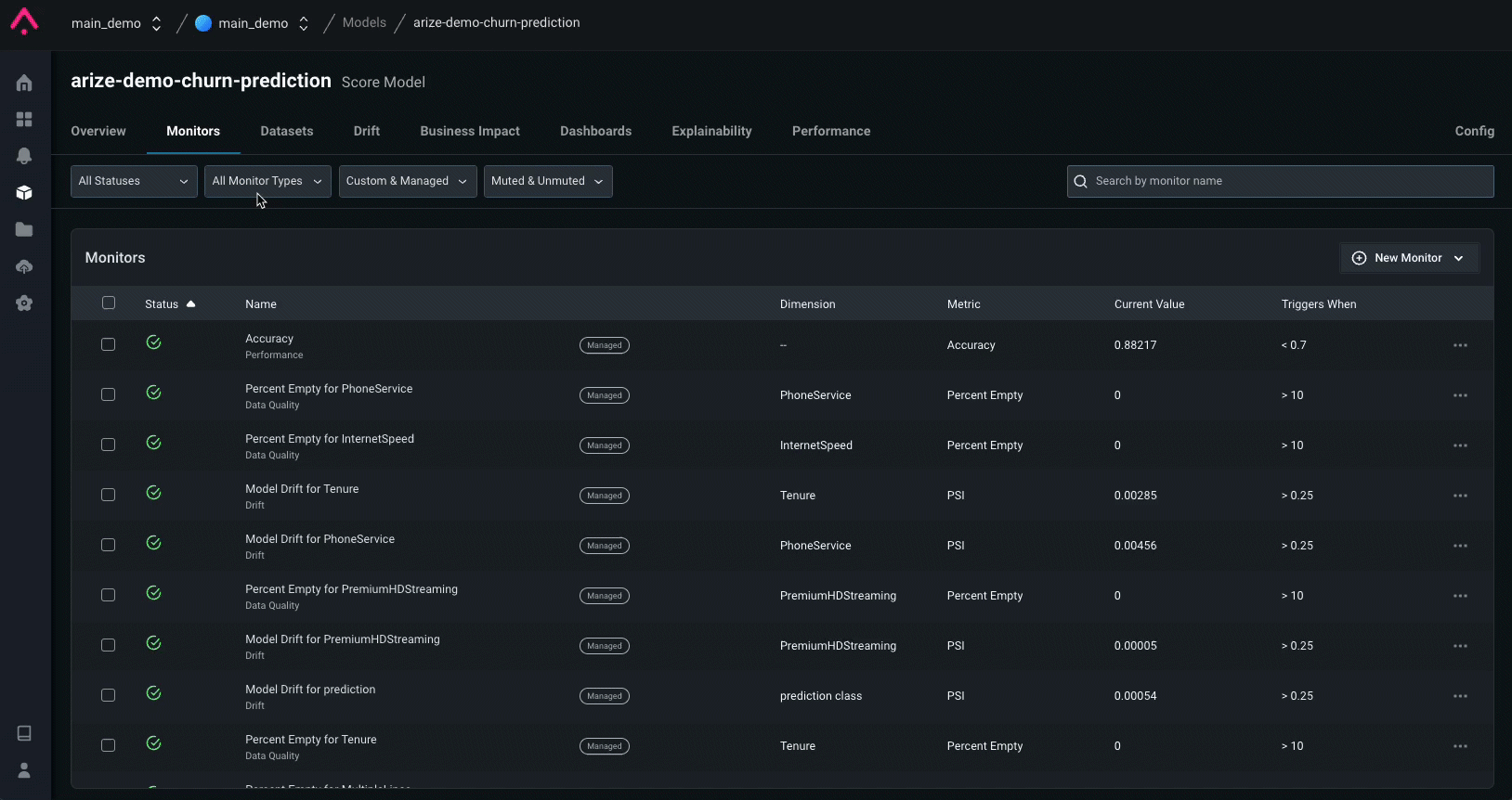 Arize sets up monitors across all features, predictions, and actual values. Below are critical metrics to monitor for a churn model:- Accuracy — of all my predictions, what percent did the model predict correctly?