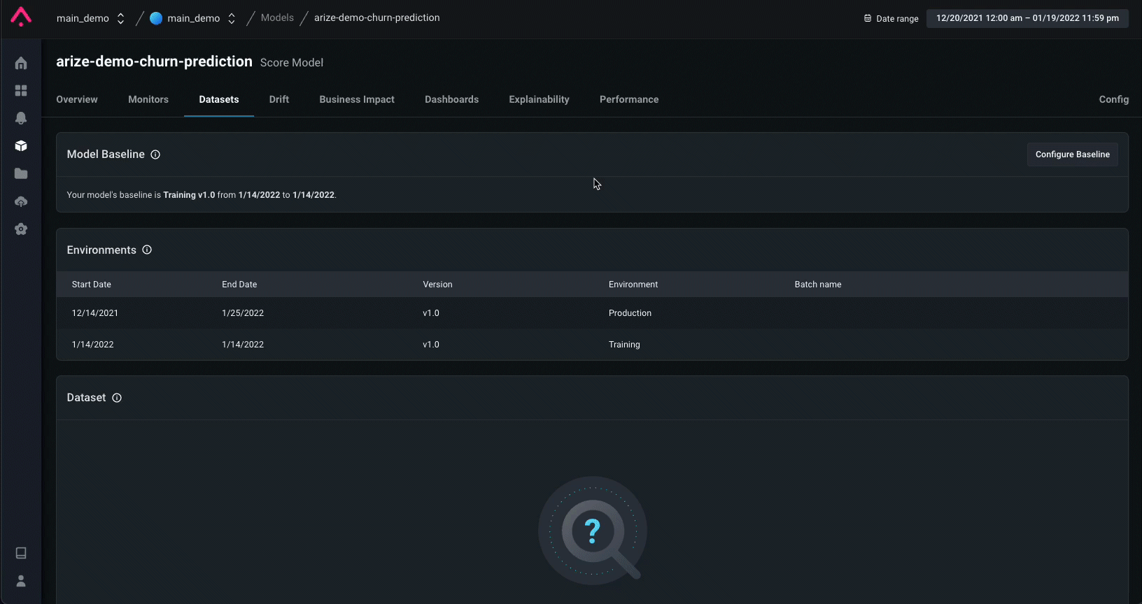 Within Arize, you can set a baseline for the model which compares your model’s behavior in production to a training set, validation set, or an initial model launch period. This allows us to determine when/where our model’s behavior has changed drastically. A baseline will help identify potential model issues, changing user behaviors, or even changes in our model’s concepts. Setting up a baseline will surface changes in the distributions of:-