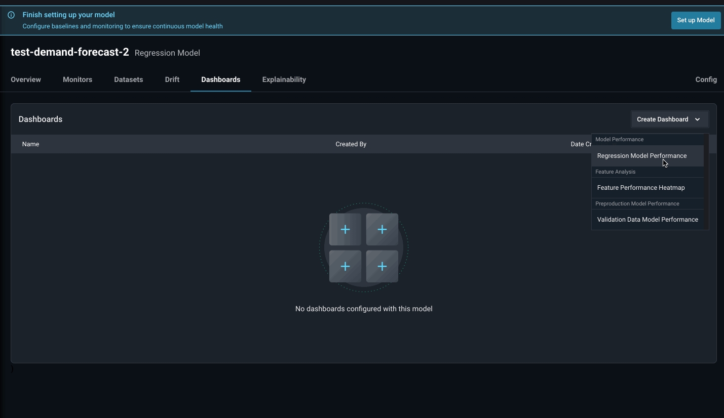 We can configure times series cards with custom model metrics on the Performance Dashboard, as shown below.