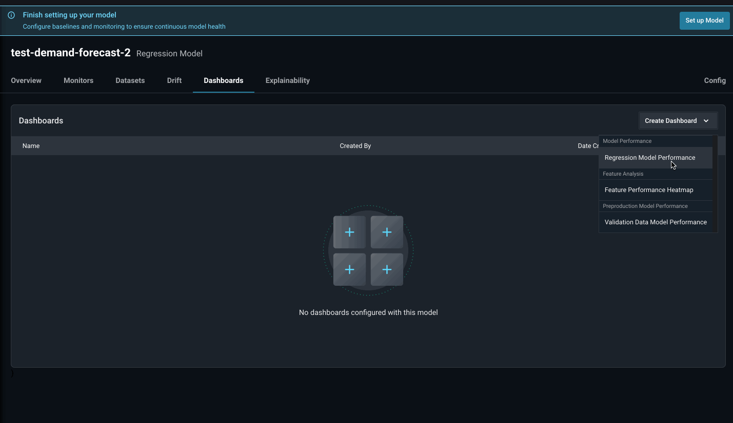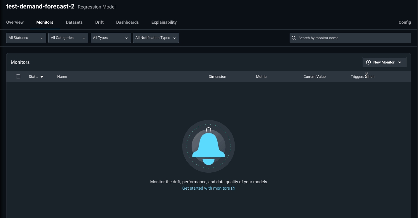 Using the Arize Dashboard function, you can quickly set-up a Mean Error monitor that notifies you when model Mean Error dips below a specific number. You can do this for any evaluation metric on Arize (i.e MAE, MSE, MAPE).