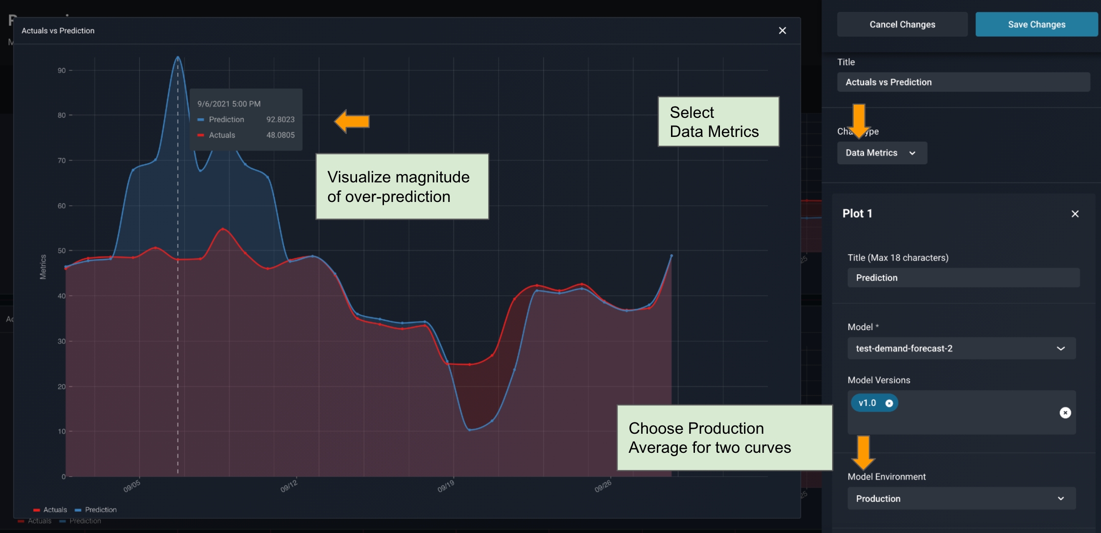 In the Arize Dashboard shown below, it’s clear that we see an over prediction event first, then an under prediction event later. We can clearly see the magnitude of these errors based on our custom configuration.