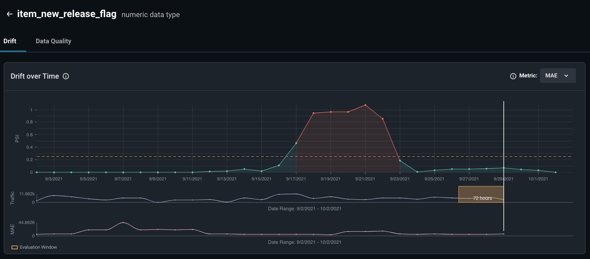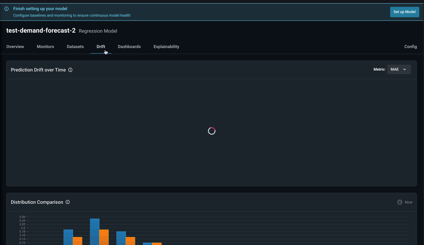 Mean Error alone is not enough to tell the story. In a feature drift event where there is both over-prediction and under prediction, mean error could be cancelled out to be zero. This is why we will not only need monitors, but a side-by-side chart to allow us to compare the magnitude and direction of both Mean Absolute Error and Mean Error. We can configure times series cards with custom model metrics on the Performance Dashboard, as shown below.