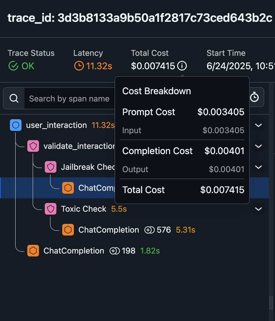 You can also inspect cost at the individual span level, including a breakdown by token type. This allows you to: