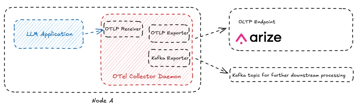 Collectors can fan out telemetry data to multiple destinations (e.g., Arize and Kafka)