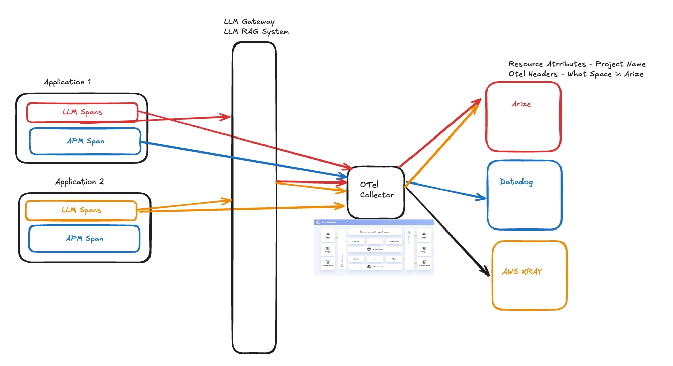 This document outlines the proposed architecture for leveraging the open-source OpenTelemetry Collector as an intermediate telemetry processing and routing layer. This pattern facilitates the collection, processing, and distribution of telemetry data (logs, metrics, traces) from instrumented applications to various observability backends such as Arize.