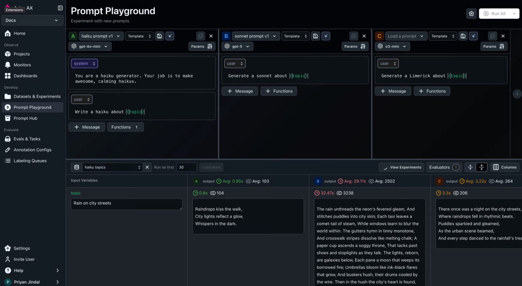 The prompt playground lets you directly compare up to three prompts at once, making it easy to evaluate performance differences, spot improvements, and identify the most effective prompt. By providing a clear, side-by-side view, it accelerates iteration, reduces guesswork, and helps you confidently choose prompts that deliver better results.
