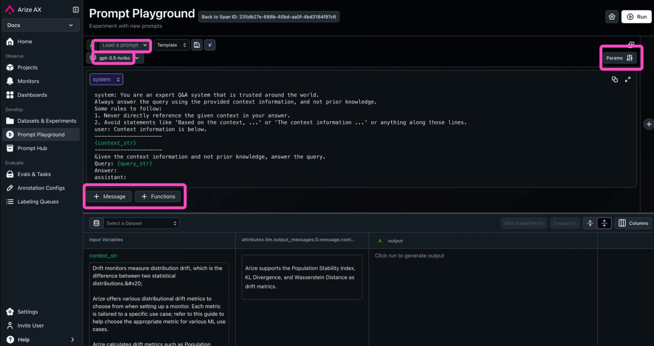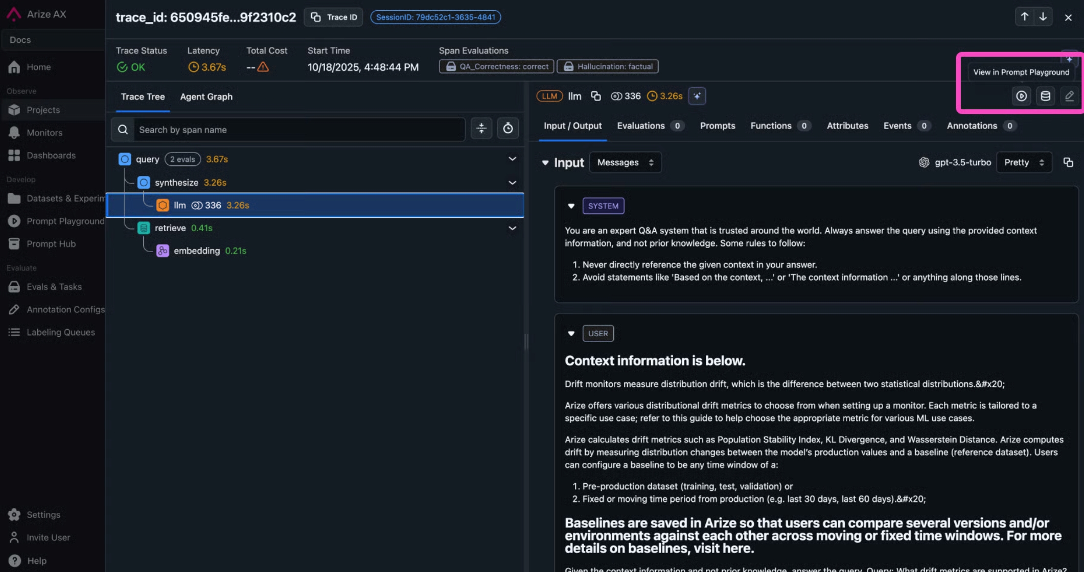 All LLM parameters, prompt templates, input messages, variables, and function definitions are automatically populated, so you can replicate the exact call without manual setup. This allows you to iterate quickly, test changes in context, and continuously refine prompts.