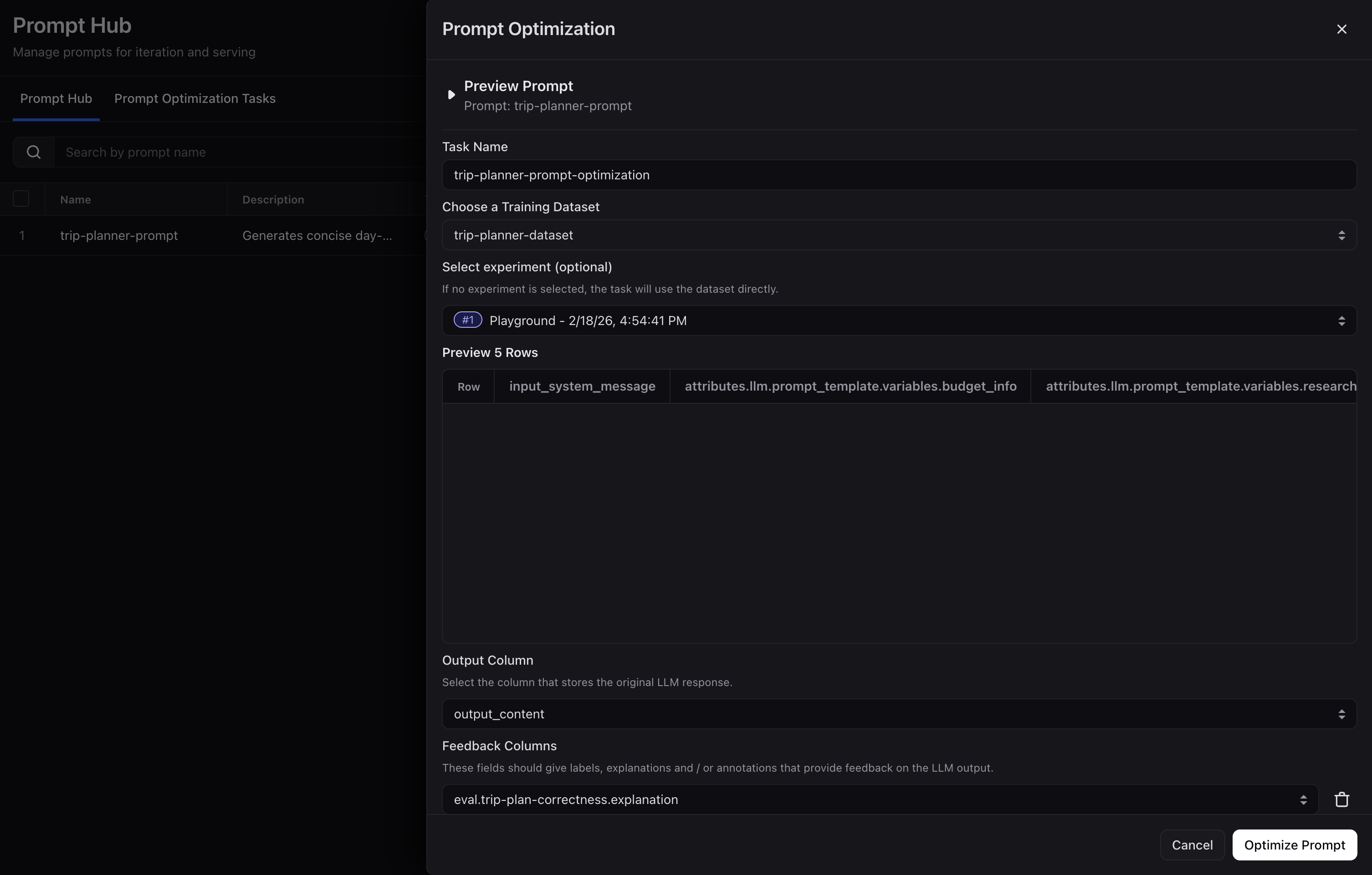 trip-planner-examplesdataset from the previous tutorial. The optimizer uses its input columns (which map to your prompt’s template variables:destination,duration,travel_style,research,budget_info,local_info). - Select the experiment — Use the Playground run from the previous tutorial. Its evaluation feedback will be used to guide the optimizer.