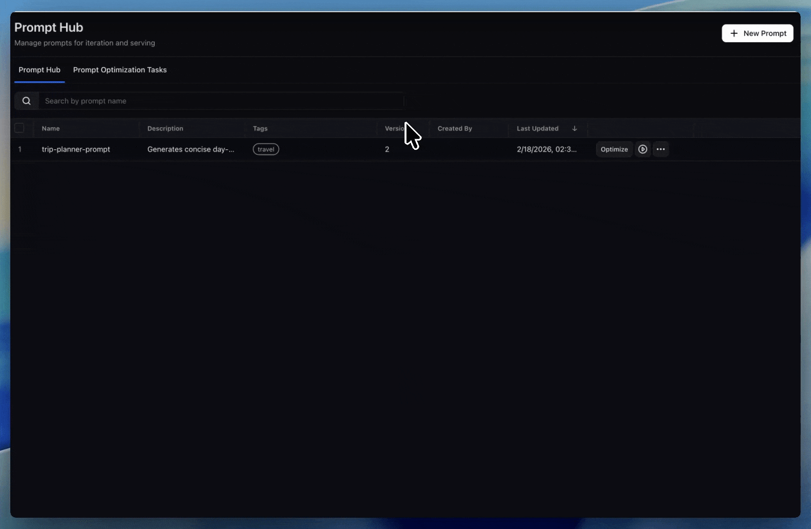 Once optimization completes, go to Prompt Hub and open yourtrip-planner prompt. You’ll see new versions in the version history.