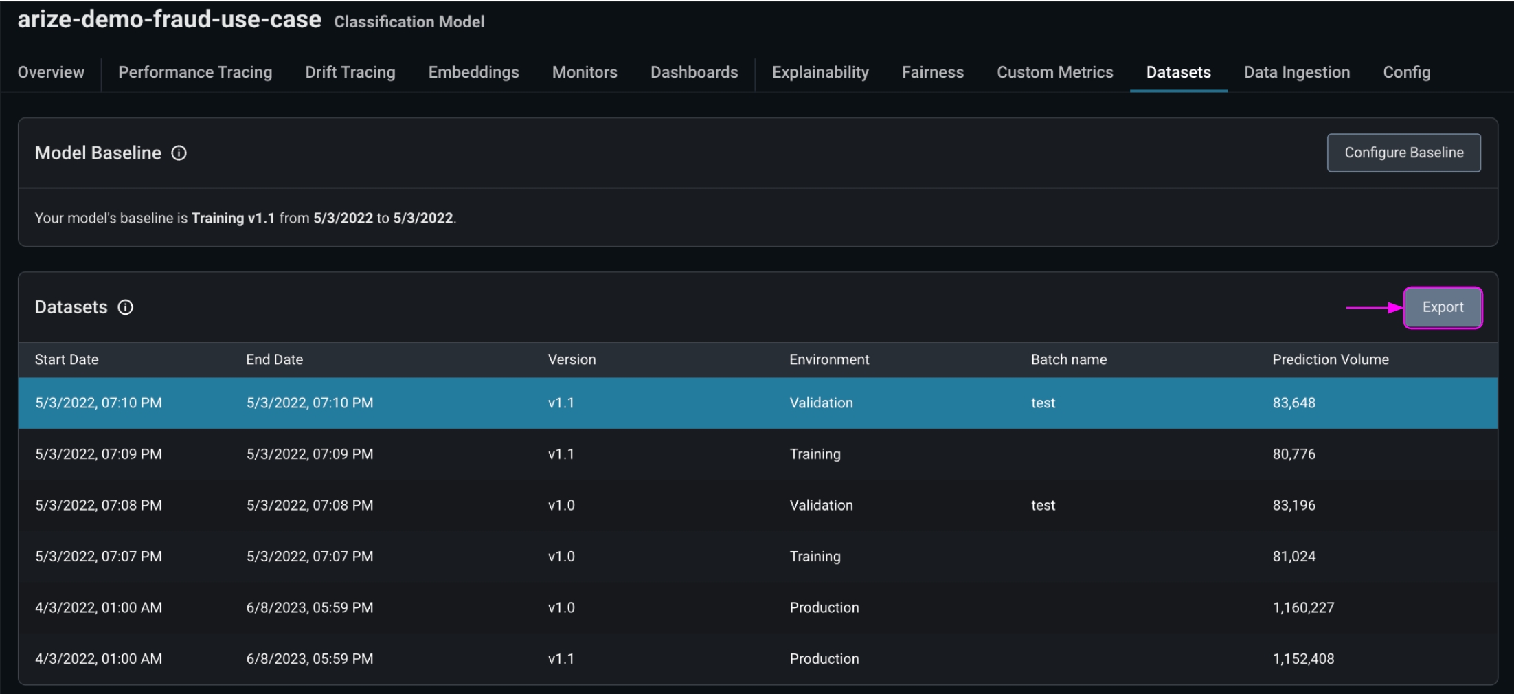 Users can also query Arize AX for data directly using the Arize Python export client. We recommend doing this once you're more comfortable with the in-platform export functionality, as you will need to manually enter in the data ranges and datasets you want to export.