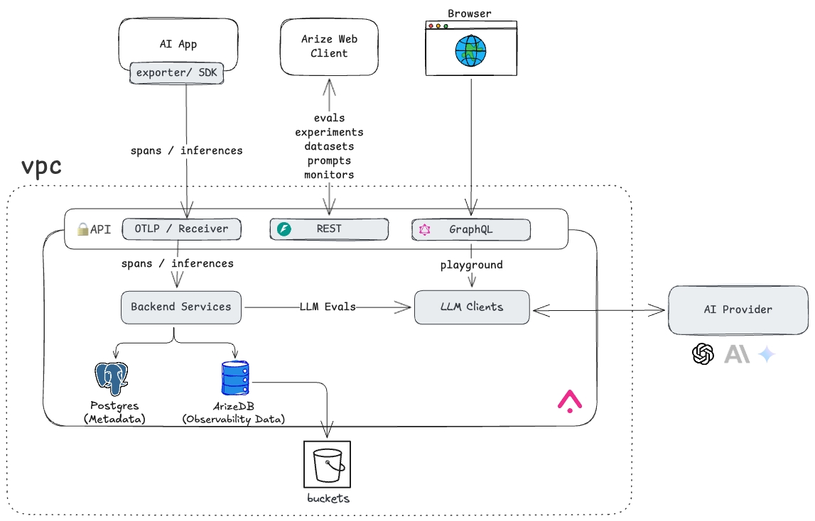 Arize On-Prem ensures that all sensitive data remains secure within the customer’s Virtual Private Cloud (VPC), with strict controls to prevent any confidential information from leaving the security perimeter.