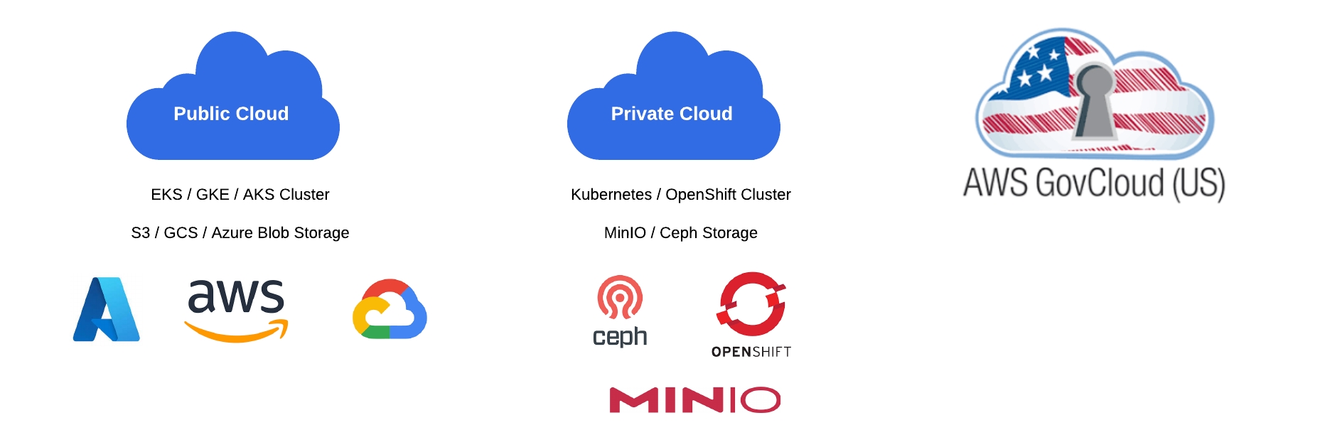 Arize seamlessly integrates with virtually any Kubernetes environment, whether in public or private clouds. It offers out-of-the-box support for popular cloud storage solutions, including AWS S3, GCP GCS, and Azure Blob.